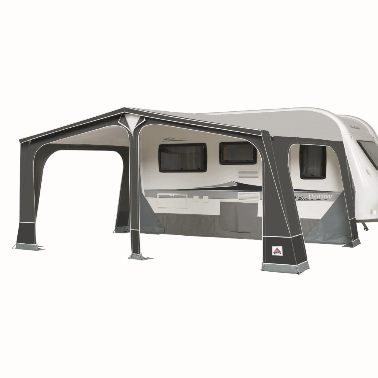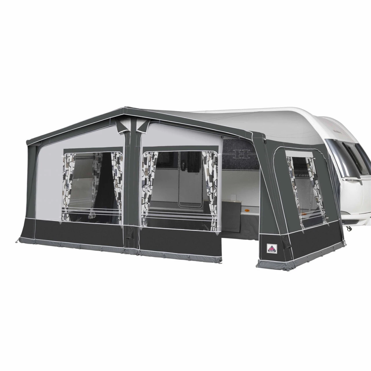 Das Doréma Maribor 240 Air All Season Größe 14 ist das erste in Serie erhältliche Luftvorzelt mit Umlaufmaß – dadurch ist eine gute Abdichtung an der Seite gewährleistet und es sind keine Andruckstangen notwendig. Du kannst es durch das EAF-System von Doréma kinderleicht aufbauen und für jede Wetterlage und Jahreszeit nutzen. Alle Vorder-, sowie Seitenwand-Segmente des Maribor 240 Air All Season sind herausnehmbar. Die Fenstes des Vorzeltes kannst Du für etwas mehr Privatsphäre mit Fensterklappen verschließen. Um eine gute Belüftung zu gewährleisten ist das Maribor 240 Air All Season mit einer permanenten Hochentlüftung, sowie einem Lüftungsfenster in einer Seitenwand ausgestattet. Das Zelt kann durch optionale Anbauten erweitert werden. Diese können rechts und/oder links am Zelt angeschlossen werden und gewährleisten zusätzlichen Stauraum. Ebenso kann das Luftvorzelt mit einem Sonnendach erweitert werden. Es verfügt dazu über einen an der Front angenähten Keder. Das Luftvorzelt Doréma Maribor AIR ist in den Größe 8 (825-850 cm) bis 19 (1.100-1.125 cm) erhältlich. Es eignet sich auch zur Verwendung an den Hubbett-Wohnwägen von Bürstner (Averso Plus, Premio Plus). Gerne beraten wir Dich hier bei der Auswahl der richtigen Größe. Das Zelt kann mit den Doréma SafeLock Abspanngurten zusätzlich abgespannt werden. Bitte beachte, dass 2 SafeLock-Set’s benötigt werden, um alle drei Abspannpunkte zu verwenden. Das Luftvorzelt ist gem. DIN EN ISO 8936 als „Typ T“ klassifiziert. Es handelt sich also um ein Reisevorzelt: geeignet für wiederholten Auf- und Abbau sowie für die Nutzung zu jeglicher Zeit des Jahres, jedoch nicht unter winterlichen Schneebedingungen.