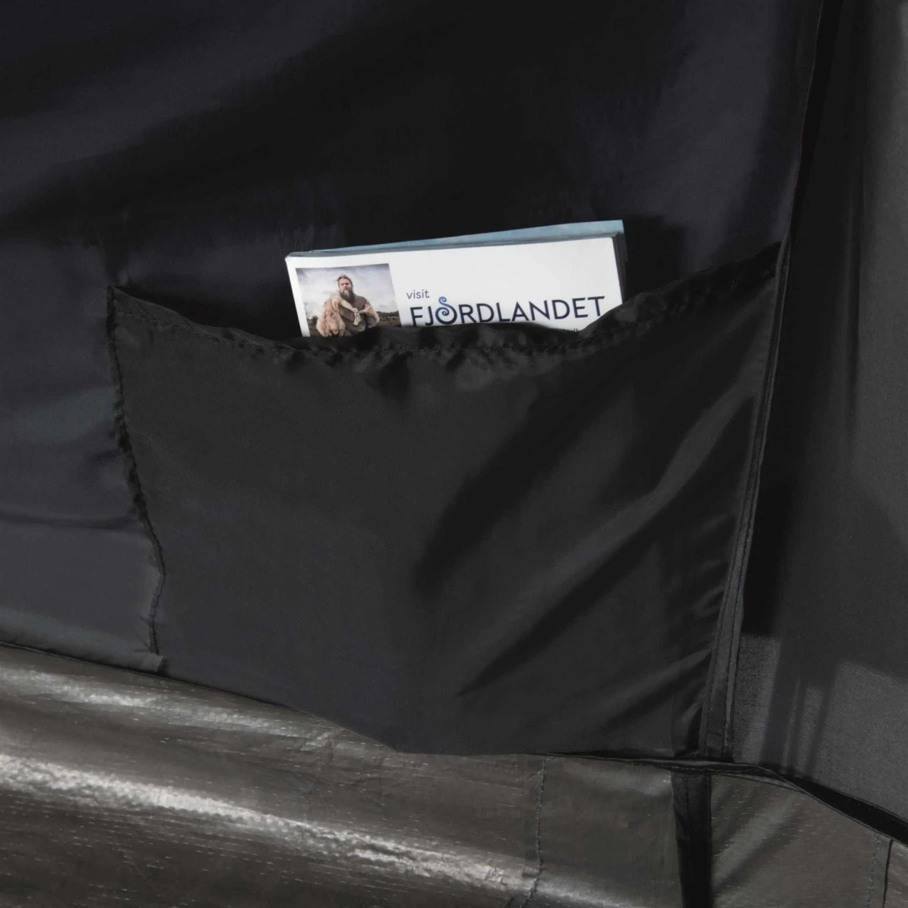 Die Eingangstür vom Außenzelt kannst du mit deinem Fahrrad zu einem Sonnensegel verwandeln. Wenn du zu neuen Abenteuern aufbrichst, kannst du die Zeltstangen in der Gestänge Tasche mit Schnallen am Rahmen anbringen. Das Zelt an sich wird mit Schnallen in der wasserdichten Packtasche am Lenker montiert.
