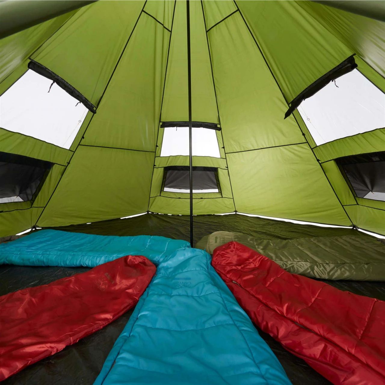 Das Grand Canyon Black Falls 8 Tipizelt ist das optimale Gruppenzelt für Abenteurer. Es bietet insgesamt Raum zum Schlafen für bis zu acht Personen oder kann tagsüber zum Zusammensitzen für größere Gruppen genutzt werden. Der traditionelle Tipi-Stil schafft eine Atmosphäre von Gemeinschaft und Geselligkeit, durch die runde Grundfläche. Innovativ an diesem Modell sind die eingearbeiteten Fenster, die viel Licht ins Innere strömen lassen und außerdem das Belüftungssystem komplettieren. Das leichte Material unterstützt den ohnehin unkomplizierten Auf- und Abbau des Black Falls 8, der ohne große Anstrengung innerhalb weniger Minuten geleistet werden kann. Die optional verwendbare Bodenplane hält Nässe und Schmutz von Dir fern.