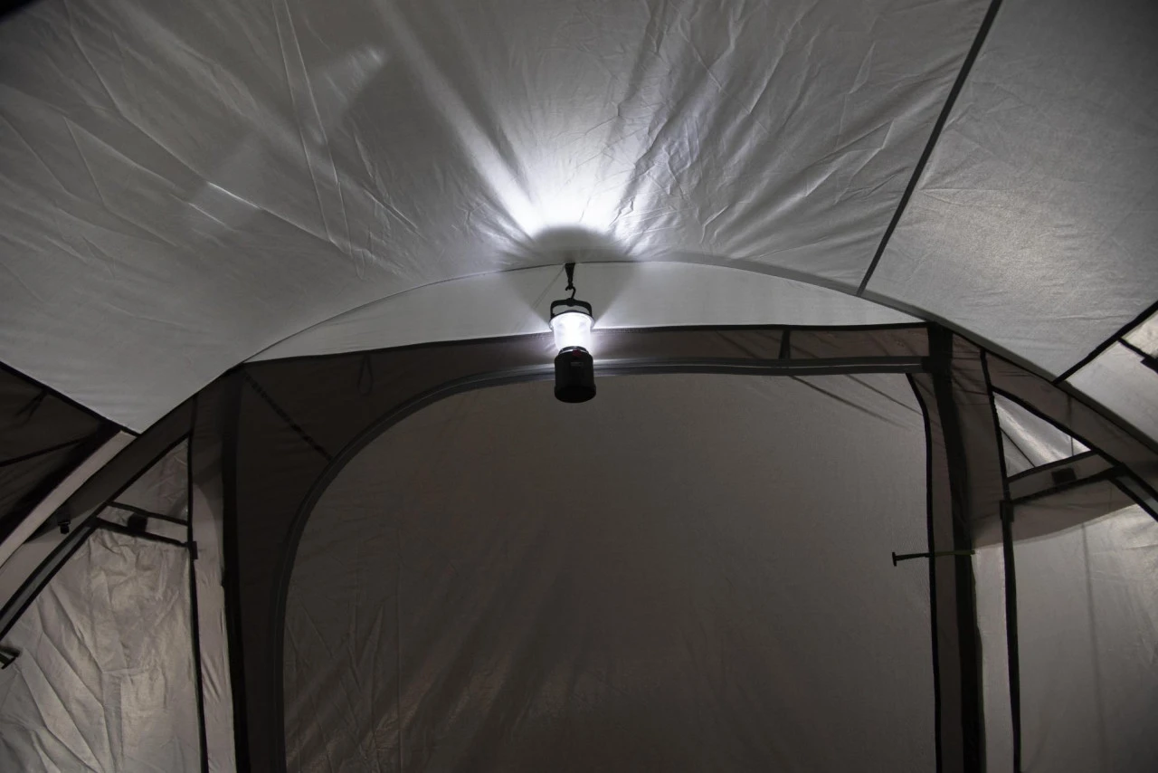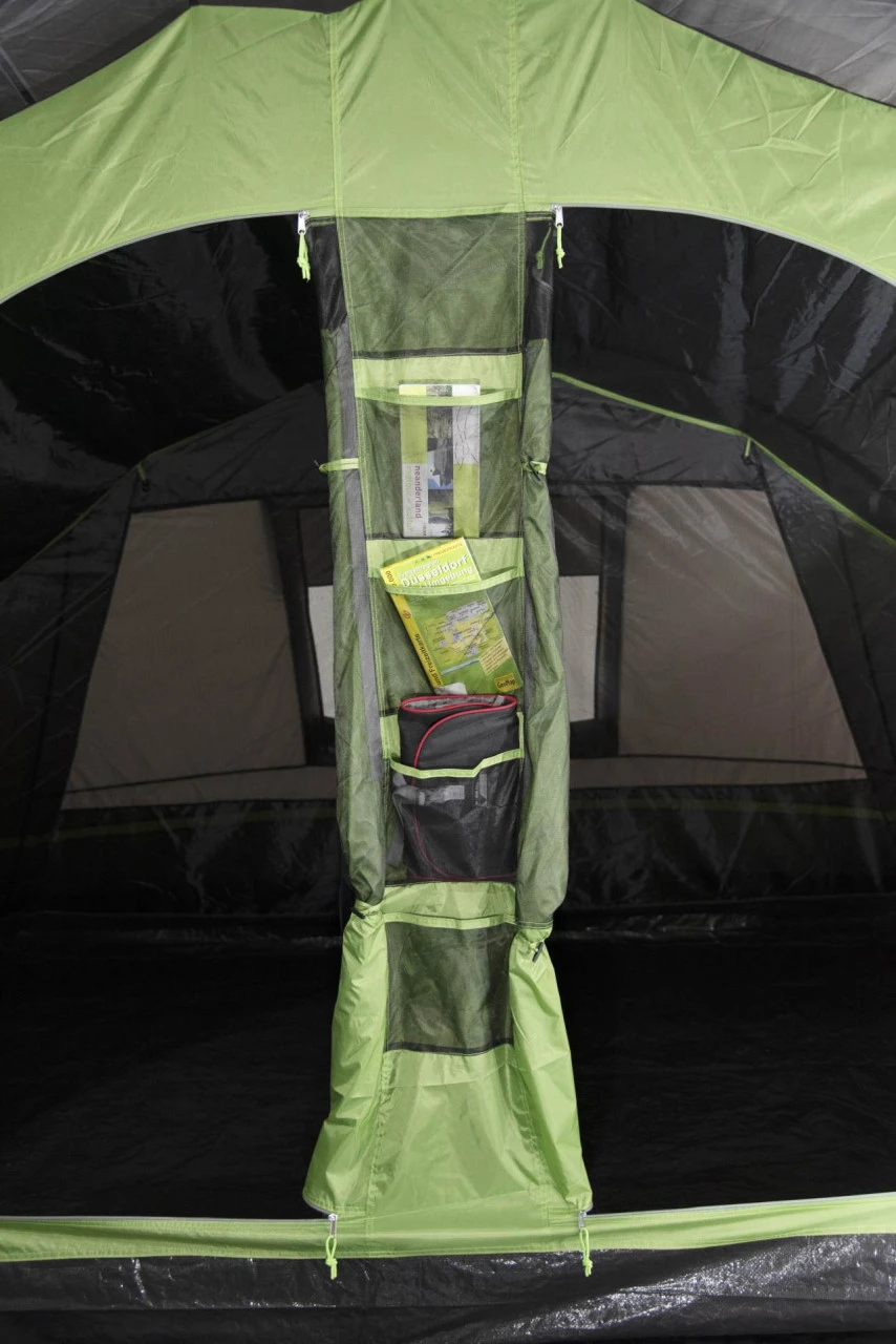 Das High Peak Meran 5.0 Familienzelt im Tunneldesign gehalten, bietet 5 Personen Platz und überzeugt mit vielen praktischen Features. In das Innere des Zeltes gelangst Du durch die Doppeltür mit Mesh-Einsätzen. Einen weiteren Zugang ins Zelt bekommst Du über den Seiteneingang. Dieser ist ebenfalls mit einer Mesh-Tür ausgestattet, sodass lästige Insekten fernbleiben. Im Inneren Deines Zeltes hast Du einen großen Wohn-/Stauraum, der Dir viel Platz zum Kochen, Spielen und Entspannen bietet. Durch die Klarsichtfolienfenster kommt viel Licht in Dein Zelt. Möchtest Du hingegen mehr Privatsphäre genießen, kannst Du die Gardinen vorziehen. Außerdem verfügt das Meran 5.0 über zwei abgedunkelte Schlafkabinen. Die beiden Schlafkabinen sind mit einer Reißverschluss-Trennwand voneinander getrennt. Möchtest Du einen großen Schlafraum haben, kannst Du die Trennwand herauszippen. Für einen besseren Schlafkomfort sind die Schlafkabinen mit zwei Vario Vent Control Eingängen mit Meshfenstern ausgestattet. Die Meshfenster können bei Bedarf geschlossen werden. Im Innenzelt befinden sich an den Seitenwänden Innentaschen. Dort kannst Du Zeitschriften oder Ähnliches verstauen. Zu den weiteren Ausstattungsmerkmalen des Meran 5.0 gehören eine Lampenhalterung, ein Dual Flow Vent System, verstellbare Spanngurtbänder, ein Kompressionspacksack und eine Positionsmarkierung, die das Einhängen des Außenzeltes erleichtert.