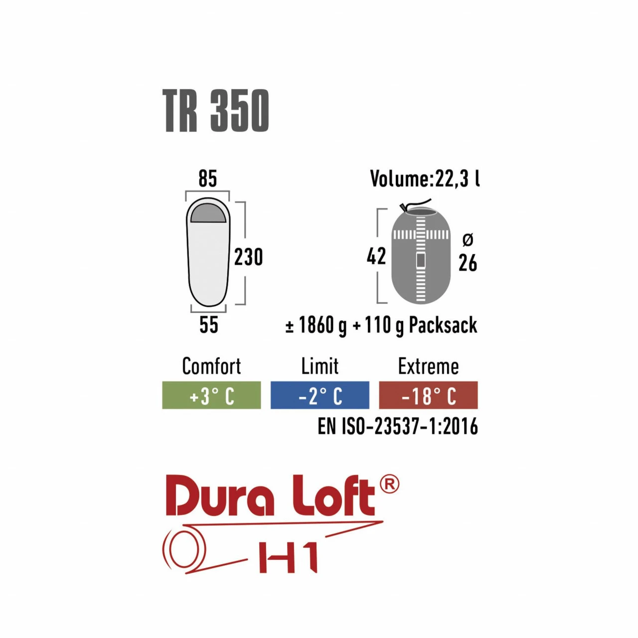 Dura Loft H1: Sehr robuste Füllung aus 6D reißfester Vollfaser und mindestens 30 % wärmespeichernder 6D Hohlfaser. Dura Loft H1 Füllung wird für die High Peak Camping-Eventschlafsäcke verwendet.