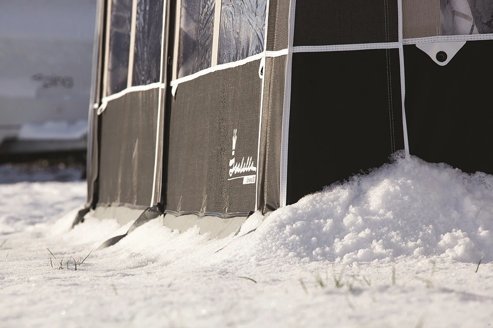 Das Isabella Winter Wohnwagenvorzelt eignet sich für alle Jahreszeiten auch für den Winter. Es besteht aus einem beschichteten PVC-Gewebe, welches sehr belastbar und leicht zu reinigen ist. Die Seitenwände des Zeltes haben Türen, die sowohl von unten als auch von oben geöffnet werden können, falls viel Schnee liegt. Mittels der Hochentlüftungen hat Dein Vorzelt ein angenehmes Zeltklima und kann bei Bedarf mittels Reißverschlusses geschlossen werden. Durch die stabile Dachkonstruktion mit spezieller Neigung fließt Wasser und Schnee besser ab. Darüber hinaus besitzt das Winter kältestabile Fensterfolien, einen Gardinensatz, eine Windblende, einen breiten Faulstreifen und einen guten Abschluss am Wohnwagen mit fest angenähten Polstern. Des Weiteren tragen die gebogene Stützstange und die Verbindungsprofile zur optimalen Stabilität und Abdichtung bei.