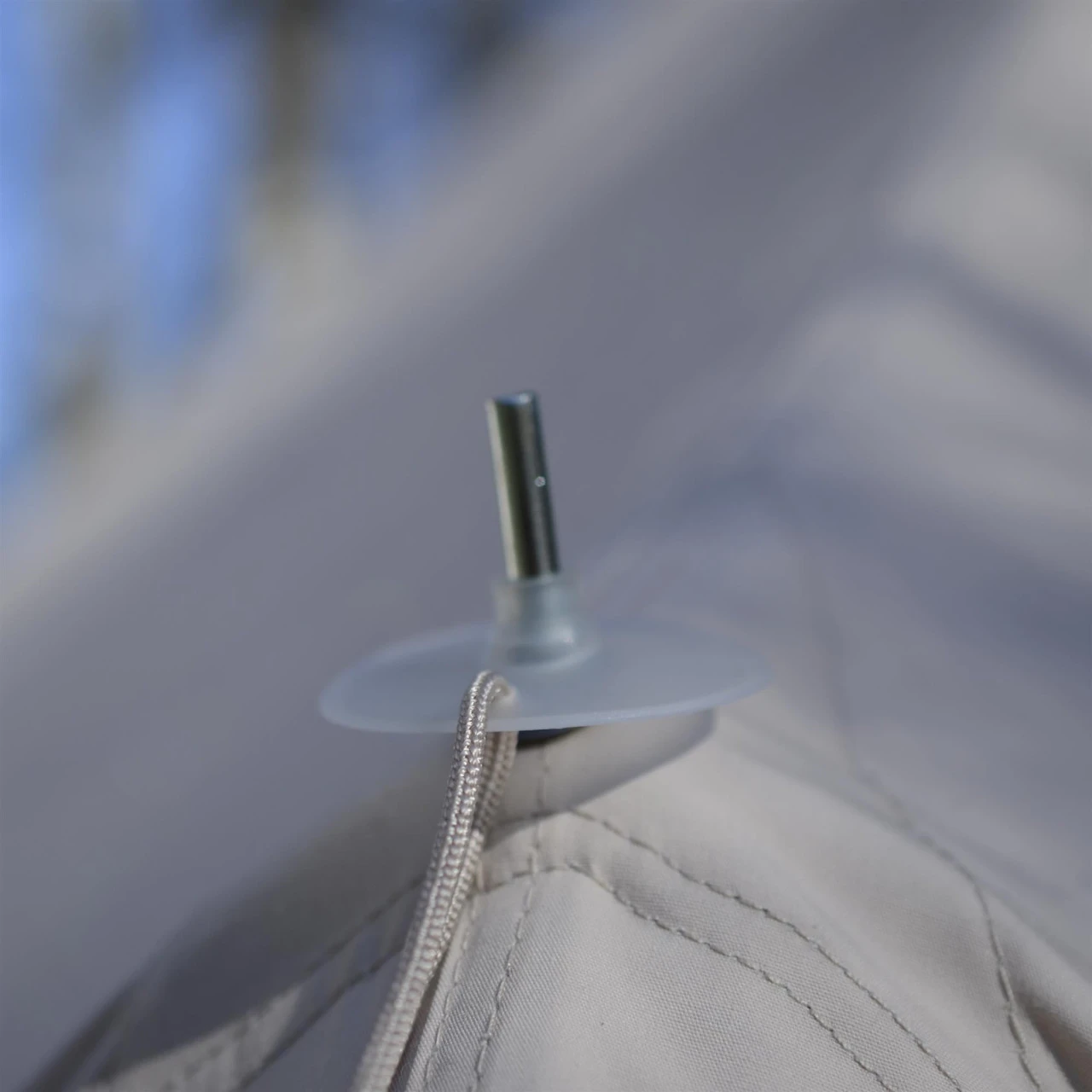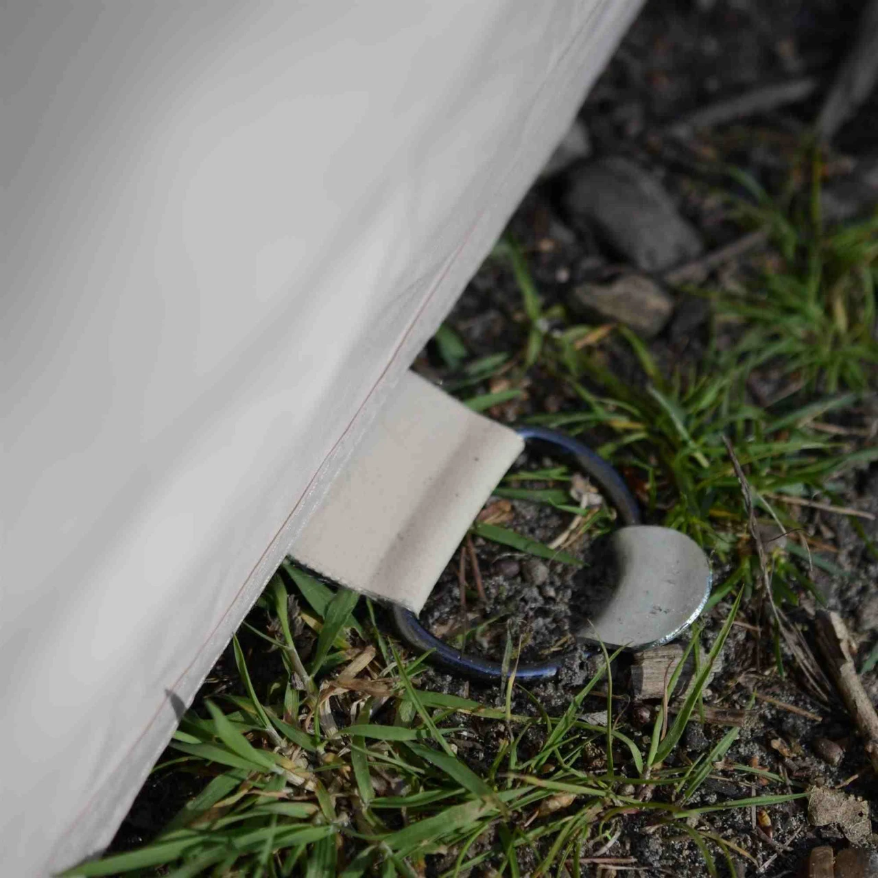 Um das Zelt aufzustellen, werden in der Mitte des Zeltes 3 Zeltstangen verwendet. Insgesamt wird das Zelt mit 7 Gestängesegmenten getragen. Eine großzügige Türöffnung liegt genau im Zentrum. 4 Belüftungsöffnungen sind am Zeltdach angebracht und schaffen eine zusätzliche, tolle und ausreichende Luftzufuhr.
