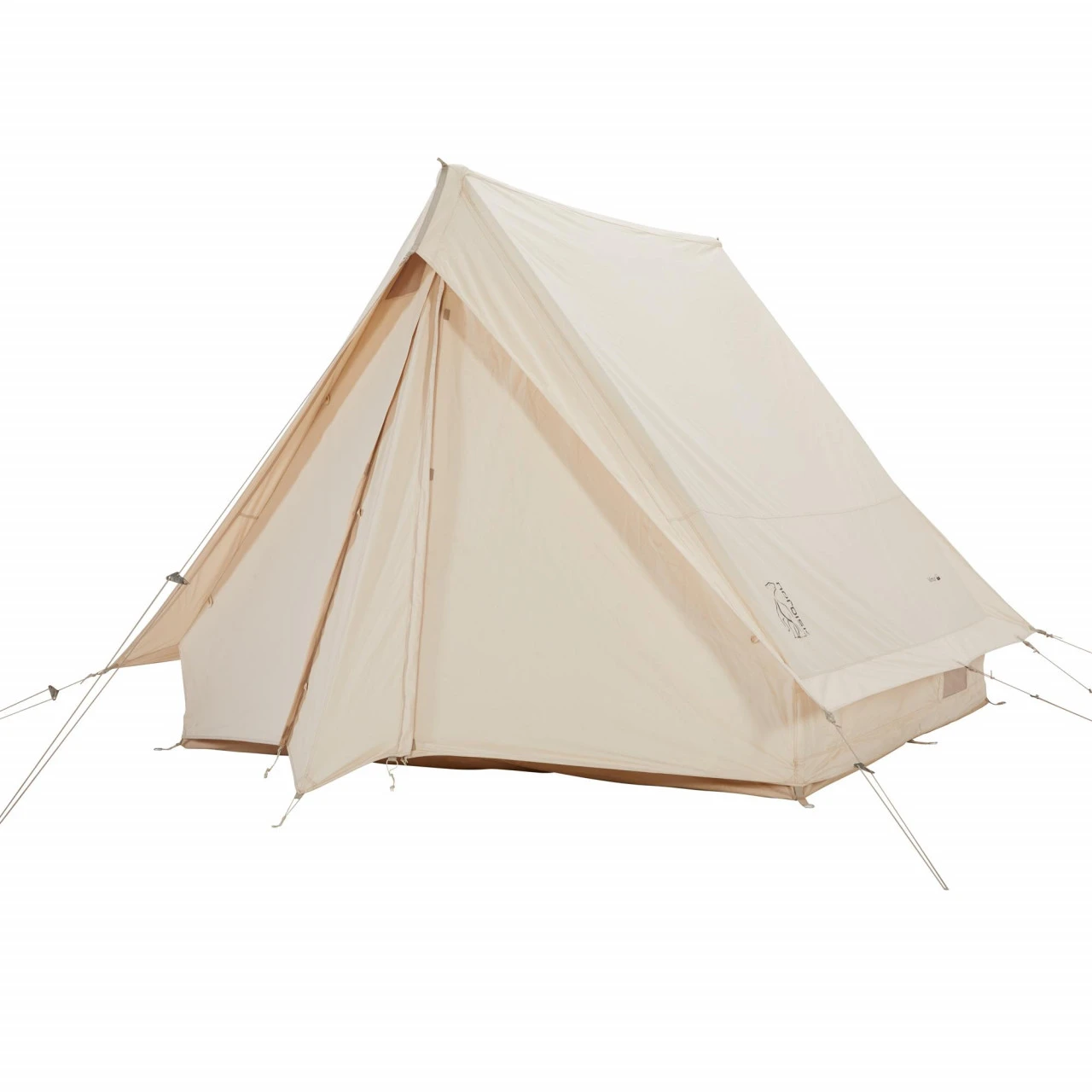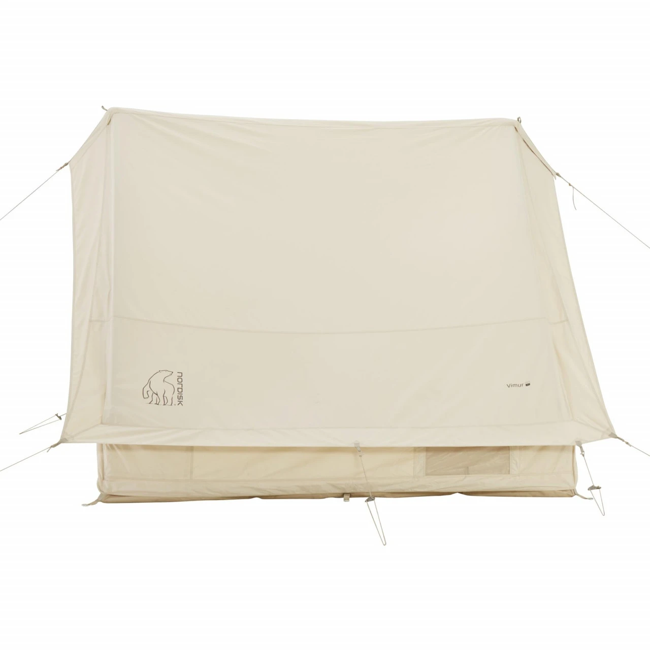 Das Nordisk Vimur 5.6 Familienzelt ist ein 4-Personenzelt, welches einen großen Schlaf-/Wohnbereich hat und sich besonders leicht aufbauen lässt. Es besteht aus einem Baumwoll-Mischgewebe und hat eine hervorragende Belüftung und ein angenehmes Raumklima. In das Innere des Zeltes gelangst Du durch eine der beiden mit Mesh ausgestatteten Türen. Der Mesh-Einsatz dient gleichzeitig als Moskitoschutz und hilft Dir so Insekten aus dem Zelt fernzuhalten. Durch die beiden Türen und zwei Fenster fällt viel Licht in das geräumige Zelt. Außerdem sorgen die Zugänge zum Zelt für eine gute Luftzirkulation im Innenbereich. Darüber hinaus verfügt die Tür über eine versteckte Erweiterung, die entfaltet, zu einer zusätzlichen Apsis wird. Zu den weiteren Ausstattungsmerkmalen des Vimur 5.6 gehören mehrere Taschen im Innenbereich in denen Du deine Wertsachen, Zeitschriften, Smartphone oder Ähnliches verstauen kannst, eine Stehhöhe in der Mitte von 3 Metern und eine eingenähte Bodenwanne. Durch die A-förmige Stangenkonstruktion ohne störende Mittelstange entsteht eine „stangenfreie“ Optik. Zusätzlich lässt sich das Vimur 5.6 mit der Midgard-Serie in der Größe und Fläche erweitern.