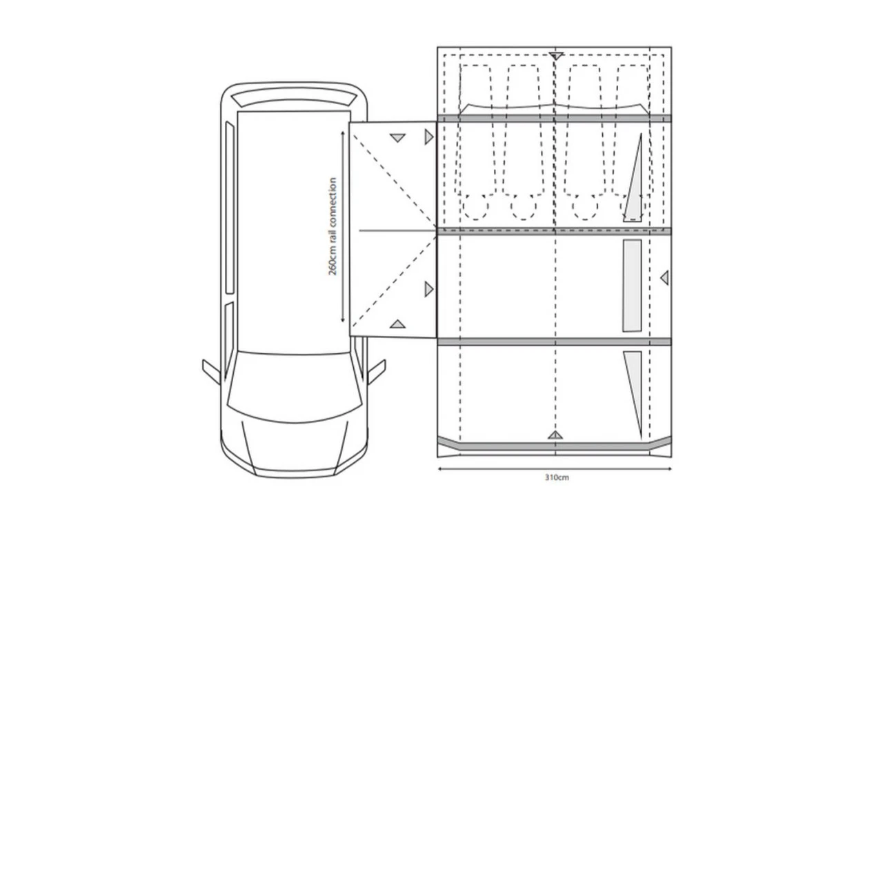 Das Outdoor Revolution Movelite T4E Busvorzelt ist das freistehende Luftvorzelt für eingeschränkte Platzverhältnisse. Denn anders als die meisten zeigt der Eingang zum Zelt in die gleiche Richtung wie die Front deines Busses. Die Verbindung zum Fahrzeug erfolgt entweder über den Einzug in die Kederschiene oder Markise, du kannst aber auch die Schleuse über das Dach spannen und befestigst die Abspanngurte mit Heringen. Damit du die maximale Flexibilität genießen kannst, mit deinem Fahrzeug jederzeit wegzufahren und wieder anzudocken, empfehlen wir als optionales Zubehör ein Driveaway Kit. Die Schleuse des Outdoor Revolution Movelite T4E Busvorzelt verfügt über eine Tiefe von 100 cm und zwei Türen. So hast du bei Bedarf zusätzlichen Stauraum und kannst bei schlechtem Wetter auch durch die Schleuse ins Vorzelt gelangen, ohne das Zelt zu verschmutzen.