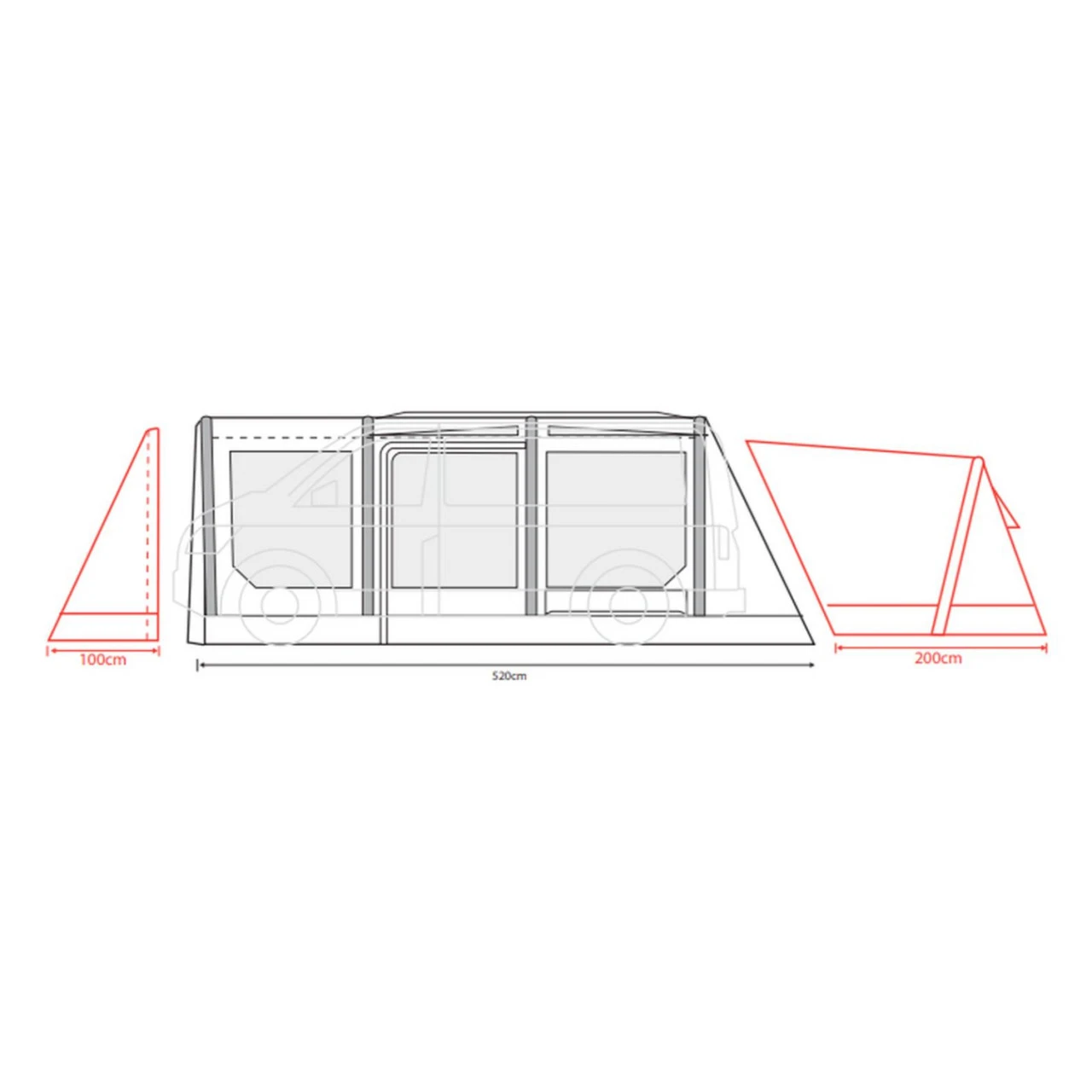 Das Outdoor Revolution Movelite T4E Busvorzelt ist das freistehende Luftvorzelt für eingeschränkte Platzverhältnisse. Denn anders als die meisten zeigt der Eingang zum Zelt in die gleiche Richtung wie die Front deines Busses. Die Verbindung zum Fahrzeug erfolgt entweder über den Einzug in die Kederschiene oder Markise, du kannst aber auch die Schleuse über das Dach spannen und befestigst die Abspanngurte mit Heringen. Damit du die maximale Flexibilität genießen kannst, mit deinem Fahrzeug jederzeit wegzufahren und wieder anzudocken, empfehlen wir als optionales Zubehör ein Driveaway Kit. Die Schleuse des Outdoor Revolution Movelite T4E Busvorzelt verfügt über eine Tiefe von 100 cm und zwei Türen. So hast du bei Bedarf zusätzlichen Stauraum und kannst bei schlechtem Wetter auch durch die Schleuse ins Vorzelt gelangen, ohne das Zelt zu verschmutzen.