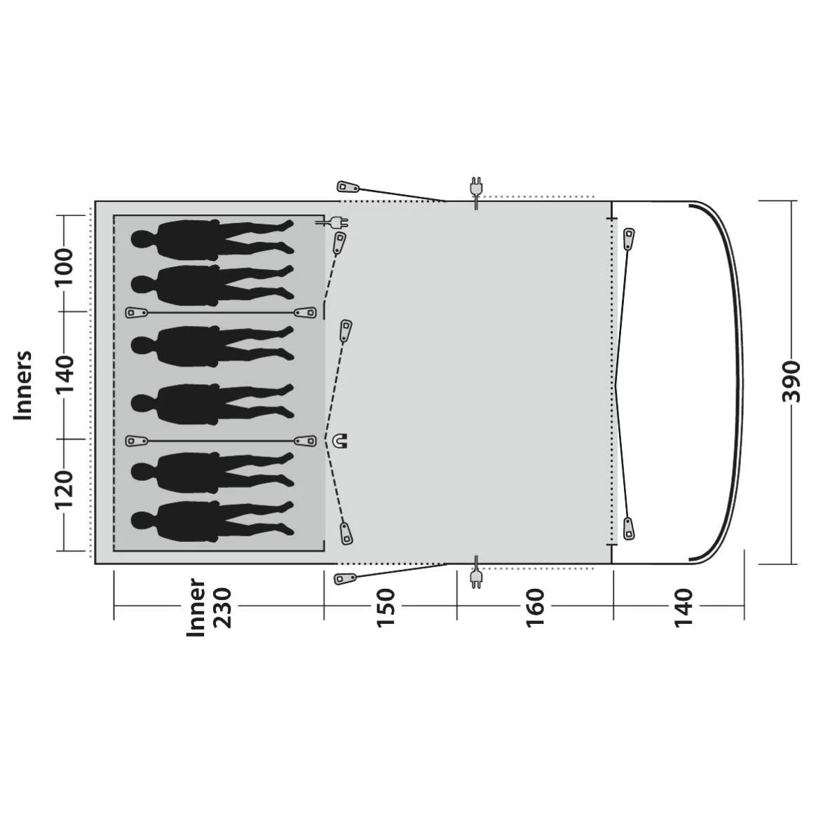 Das Outwell Colorado 6PE Familienzelt bietet 6 Personen Platz und eignet sich ideal für Deine Reise mit der Familie oder Freunden. In das Innere des Zeltes, gelangst Du durch die mit einem Moskitonetz ausgestatteten Vordertür. Das Vordach verfügt über eine vertikale Frontwand, mit der Du deinen Wohnraum im und vor dem Zelt optimal nutzen kannst. Die Vordertür ist mit einem doppelten Reißverschluss versehen und kann komplett geöffnet werden. Die drei Master-Schlafkabinen vom Typ Ambassador sind abgedunkelt, sodass Deine Nächte länger und entspannter werden. Darüber hinaus ist die Tür mit dem Quick and Quiet-Magnetverschluss versehen, mit dem Du die Schlafkabine geräuschlos öffnen und verlassen kannst. Für einen besseren Schlafkomfort sind die Schlafkabinen zusätzlich mit Lüftungsöffnungen mit Netzstoff ausgestattet. Diese können bei Bedarf komplett geschlossen werden. Im Innenzelt befinden sich an den Seitenwänden Netztaschen. Dort kannst Du Zeitschriften oder ähnliches verstauen. Zu den weiteren Ausstattungsmerkmalen des Colorado 6PE gehören zwei zusätzliche mit Netzeinsätzen versehene Seiteneingänge, die Dir einen flexiblen Zugang ins Zelt gewähren. Die großen, getönten Fenster mit Reißverschlussvorhängen bieten Dir in deinem Zelt einen besonders guten Lichteinfall. Außerdem hast Du einen hervorragenden Blick auf Deine Umgebung. Wenn Du hingegen mehr Privatsphäre genießen möchtest, können die Fenster auch komplett geschlossen werden. Damit Dein Zelt ein wenig wohnlicher wird, verfügt das Zelt über das HookTrackSystem. Dieses System bietet Dir vielseitige Möglichkeit Gegenstände oder Lampen aufzuhängen. Für eine optimale Belüftung sorgt das neue Hinterlüftungssystem (Rear Vent System). Diese kann sowohl bei geschlossenem als auch beim geöffneten Zelt benutzt werden. Abschließend verfügt das Colorado 6PE über das Floating Guyline System. Dieses System reduziert den Aufwand beim Aufstellen des Zeltes, beseitigt Stolperfallen und vereinfach das Anpassen der Seilspannung am Zelt.