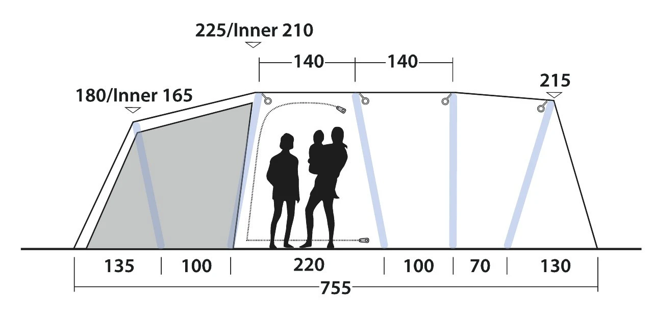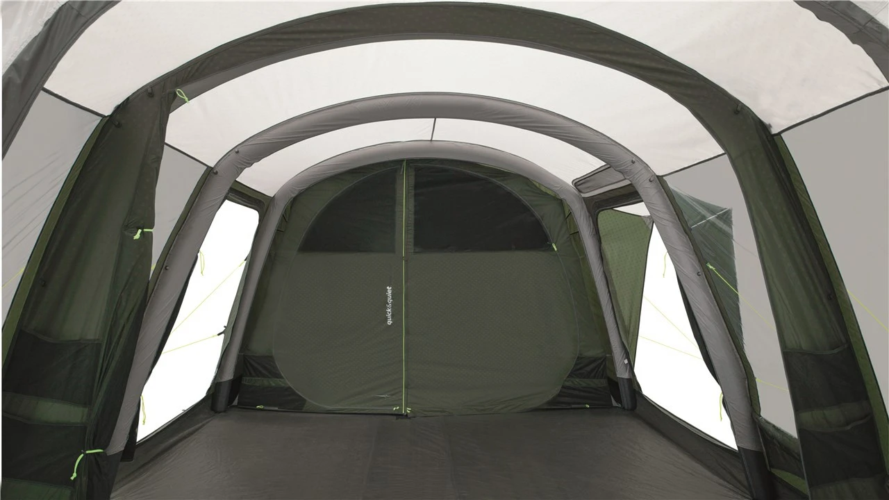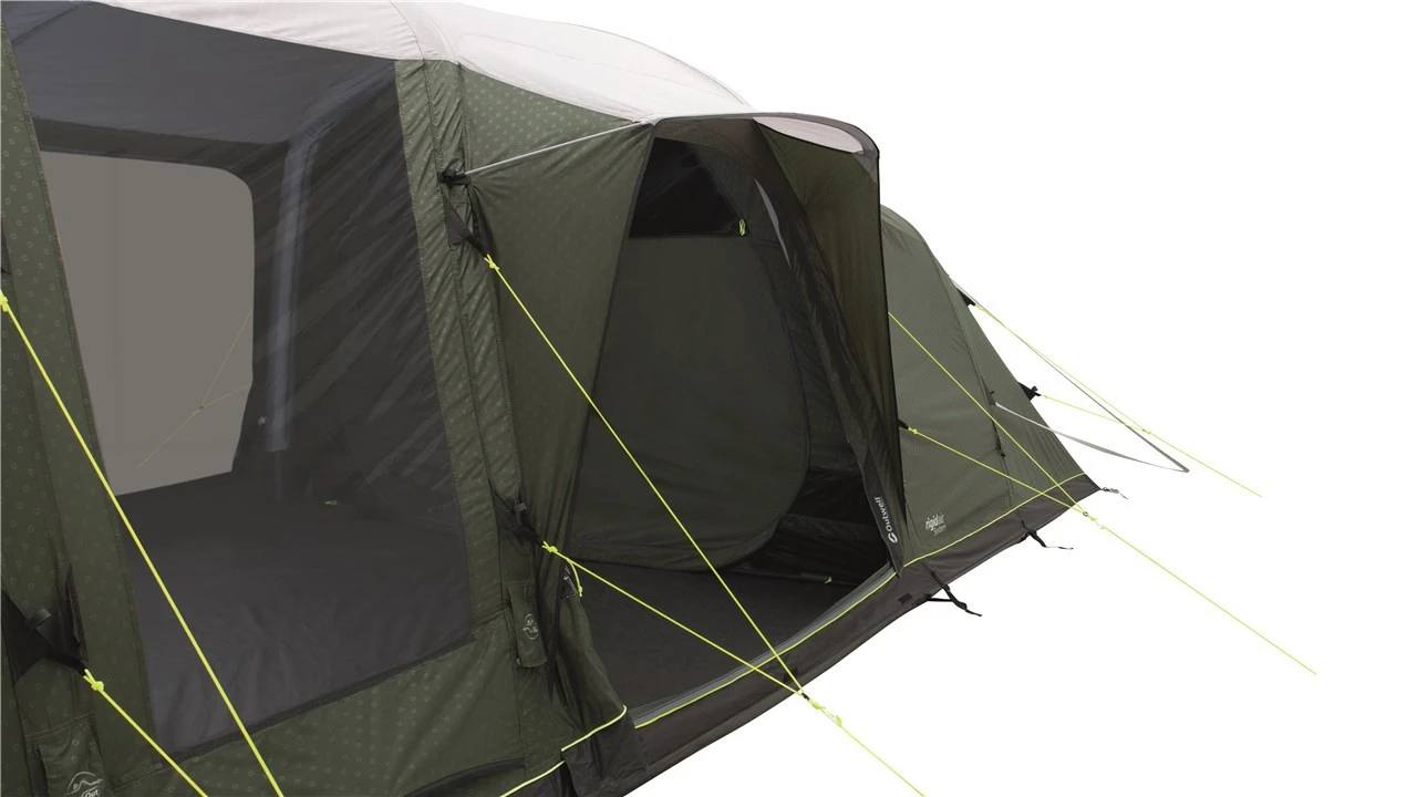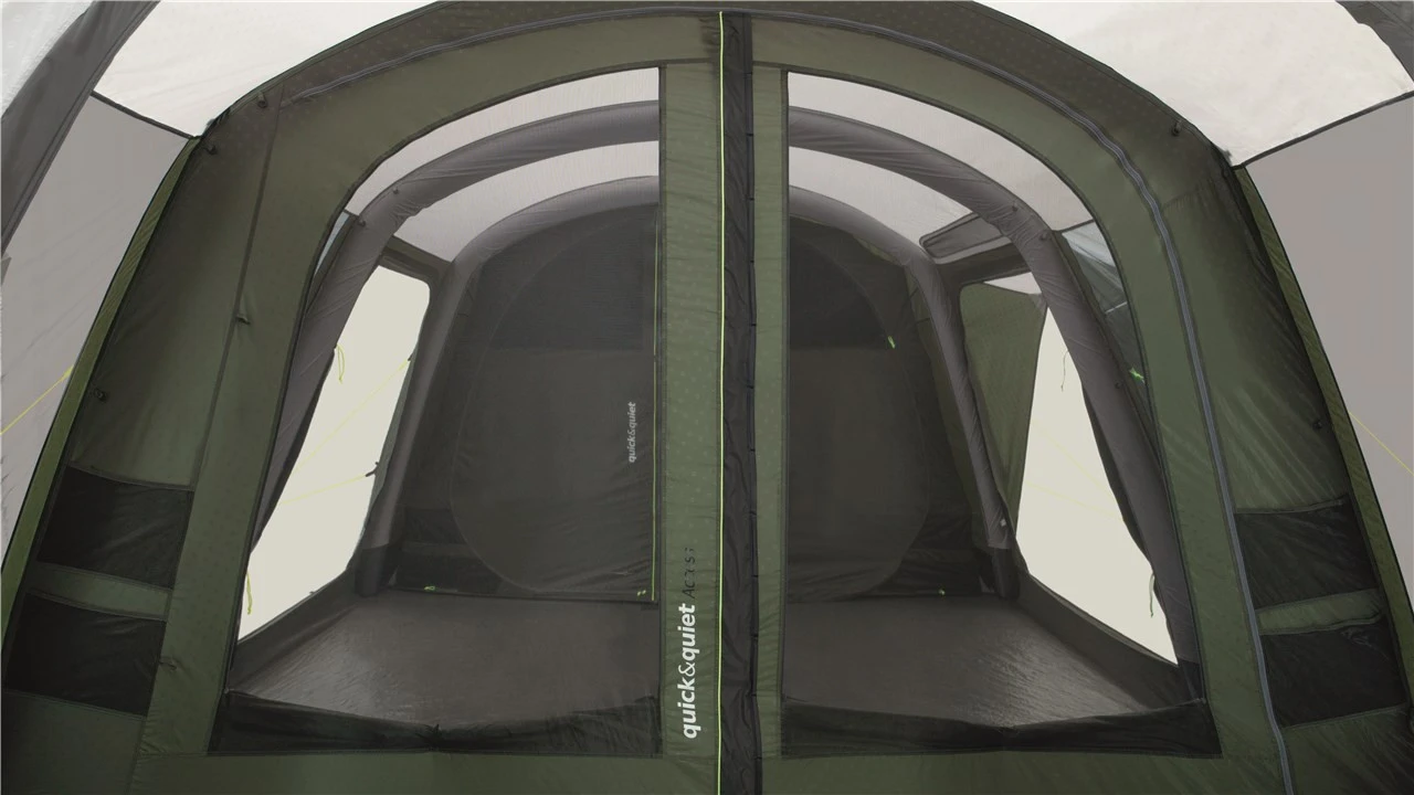 Der Eingang zum Wohnbereich ist mit einer Quick & Quiet Tür ausgestattet. Diese Tür verfügt über ein Magnetband, durch das sie sich nahezu geräuschlos öffnen lässt und schließt. Sie lässt sich aber durch die Reißverschlüsse auch komplett verschließen. In die Schlafkabine gelangst du ganz leise auch durch eine Quick & Quiet Tür. Du kannst die abgedunkelte Premium-Schlafkabine durch einen Reißverschlussvorhang in 2 separate Schlafkabinen verwandeln. Zur optimalen Belüftung des Outwell Jacksondale 5PA gibt es an der Rückseite über die gesamte Breite eine individuell einstellbare Belüftung. Zusätzliche Belüftungsmöglichkeiten gibt es auch im Wohnbereich.