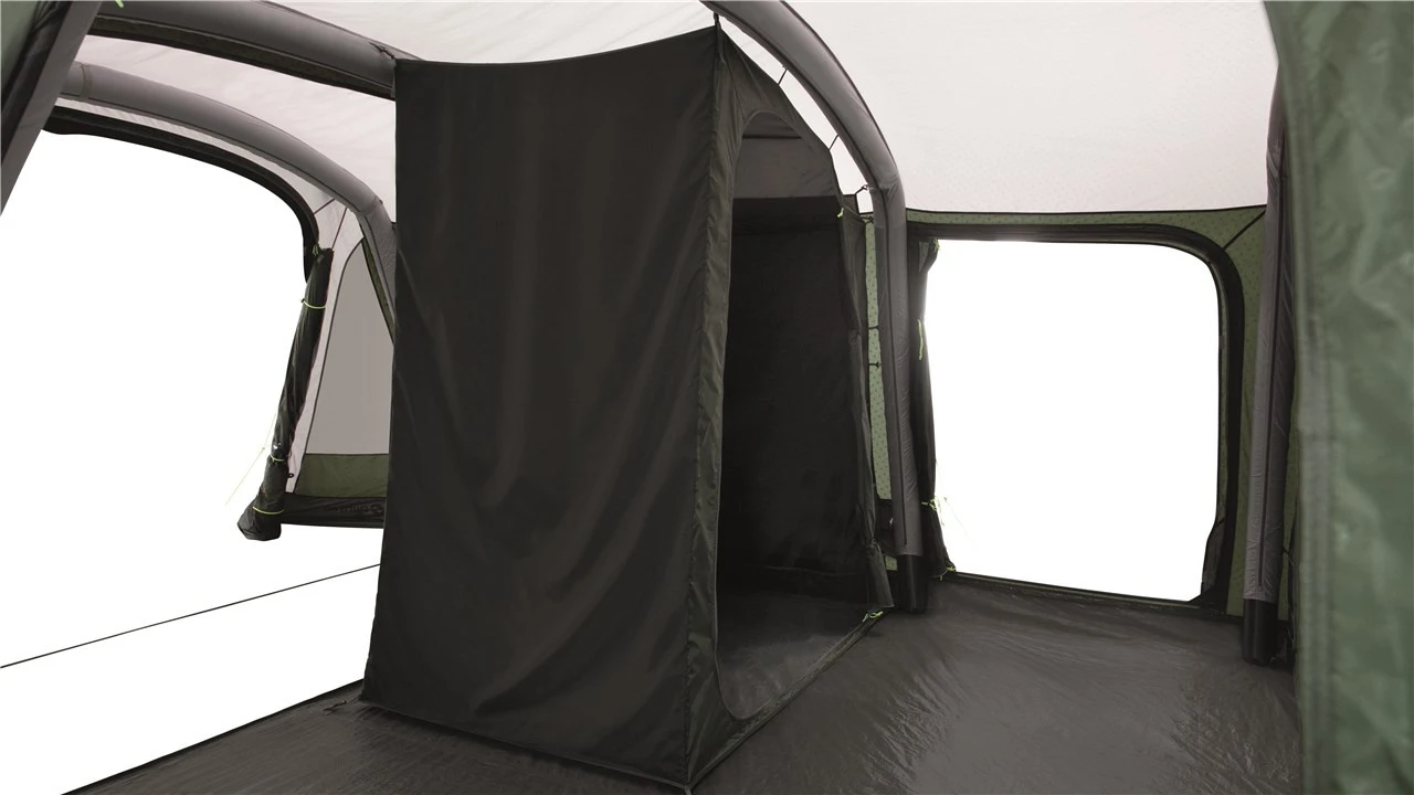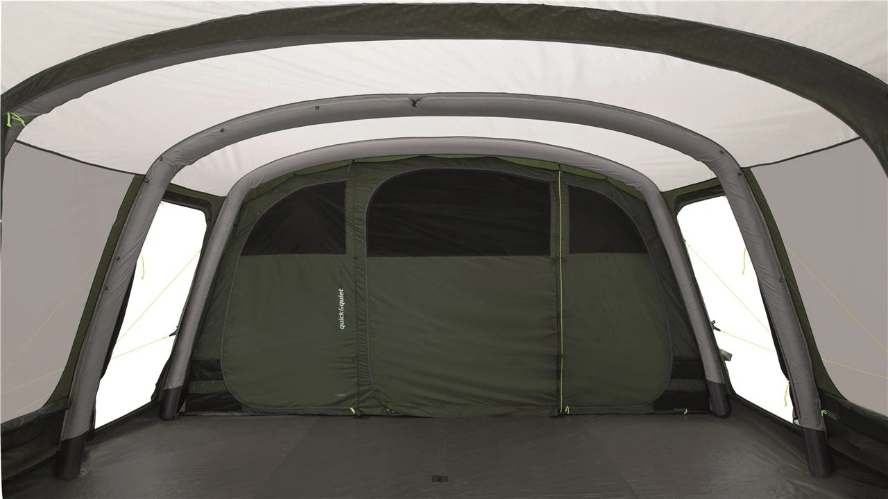 Das großzügig geschnittene Outwell Queensdale 8PA Familienzelt lädt zum Verweilen mit bis zu 8 Personen ein und wird dank der am Außenzelt liegenden Ventile ist es schnell mit Luft gefüllt und aufgestellt. Es ist ein Dreiraumzelt und gliedert sich in folgende Abschnitte: eine Nasszelle, einen Wohnraum und einen Schlafbereich. Der Schlafbereich ist mit 3 abgedunkelten Premier-Schlafkabinen mit Netzbelüftung für mehr Schlafkomfort ausgestattet. Ein zusätzliches, abgedunkeltes Innenzelt kann sowohl als Schlafkabine oder als Abstellraum verwendet werden. Neben der Fronttür verfügt das Zelt auch über zwei zusätzliche Seitentüren mit denen Du einen flexiblen Zugang ins Innere des Zeltes hast. Die Eingänge sind mit einem Moskitonetz ausgestattet und die Fronttür besitzt einen zusätzlichen Quick and Quiet Magnetverschluss. Bei Bedarf kannst Du die Fronttür komplett öffnen und für eine angenehme Belüftung sorgen. Das helle Außenzeltdach sorgt für ein freundliches Innenleben. Die großen, getönten Fenster bieten einen guten Ausblick auf Deine Umgebung und können bei Bedarf verschlossen werden. Damit das Queensdale 8PA ein wenig wohnlicher wird, verfügt das Zelt über das HookTrackSystem. Dieses System bietet Dir vielseitige Möglichkeit Gegenstände oder Lampen bis 1,5 kg aufzuhängen. Möchtest Du kleine Gegenstände sicher sowie griffbereit verwahren, kannst Du diese in die seitlichen Netztaschen im Innenzelt hineintun. Musst Du die Schlafkabine nachts mal verlassen, hilft Dir die Quick&Quiet-Tür dabei Deine Begleiter nicht aufzuwecken. Die Tür wurde mit einem Magnetband ausgestattet, welches ein fast geräuschloses Verlassen der Schlafkabine ermöglicht. Für eine optimale Belüftung sorgt das neue Hinterlüftungssystem. Diese kann sowohl bei geschlossenem als auch beim geöffneten Zelt benutzt werden.