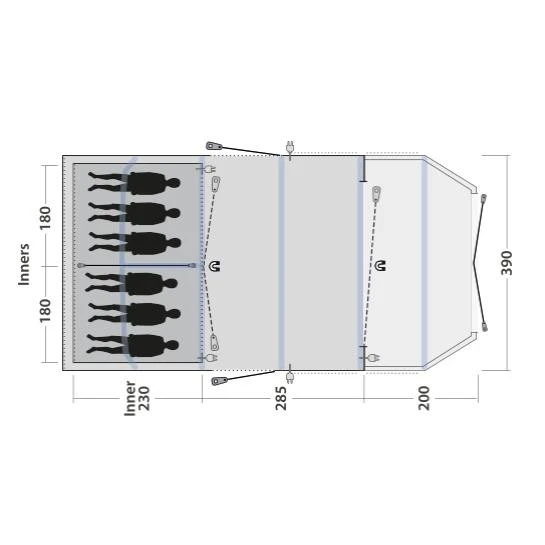 In den Wohnraum gelangst du entweder durch die große, patentierte Quick & Quiet Door mit Magnetverschluss oder durch einen der beiden Seiteneingänge. Die Quick & Quiet Tür kann auf unterschiedliche Arten verwendet werden. Entweder, du nutzt sie mit dem Magneteingang, um dein Zelt geräuschlos betreten oder verlassen zu können, oder du benutzt sie wie einen herkömmlichen Zelteingang. Durch die Reißverschlüsse lässt sich die Tür komplett verschließen. Der eingenähte Boden sorgt zudem dafür, dass keine Insekten ins Zelt gelangen. Mit Hilfe des HookTrack-Systems kannst du z.B. Lampen oder eine Wäscheleine flexibel im Wohnraum deines Zeltes aufhängen.