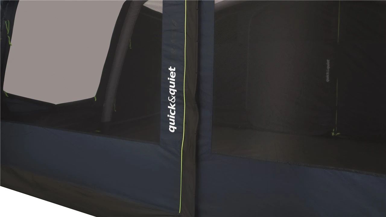 Das Outwell Springville 6SA Familienzelt ist ein Zweiraumzelt mit drei abgedunkelten Schlafkabinen und eignet sich ideal für einen Trip mit bis zu 6 Personen. Es lässt sich durch das Power Air System schnell und einfach aufbauen. Das Power Air System bietet eine langlebige individuelle Luftschlauchtechnologie mit vorgeformten Schläuchen im gotischen Stil, die über leicht zugängliche externe Ventile außerhalb des Zeltes aufgepumpt oder entleert werden können. Die Luftschläuche im gotischen Stil bieten große Kopffreiheit und viel Platz im Innenraum. In das Innere des Springville 6SA gelangst du durch einen der drei mit einem Moskitonetz ausgestatteten Eingänge. Die Fronttür des Zeltes wurde mit dem Quick & Quiet Magnetverschluss ausgestattet und gewährt dir einen geräuschlosen Zutritt ins Zelt. Das Zelt besitzt große, getönte Fenster, die viel Licht ins Innere lassen. Für mehr Privatsphäre und Schatten können diese einfach mit den Vorhängen abgedunkelt werden. Eine völlig wasserdichte und eingenähte Bodenplane verhindern, dass Nässe und Insekten hineinfinden. Das integrierte HookTrack-System ermöglicht dir eine vielseitige Positionierung von Lampen und Gegenständen bis zu 1,5 kg. Möchtest du im Zelt ein wenig Ordnung halten, helfen dir Netztaschen im Innenzelt. Dort kannst du kleine Gegenstände sicher und griffbereit aufbewahren. Für eine angenehme Belüftung im Zelt sorgen das Low Ventilation System und das Rear Ventilation System. Diese regulieren den Luftstrom von geschlossenem bis vollständig geöffneten Reißverschluss.