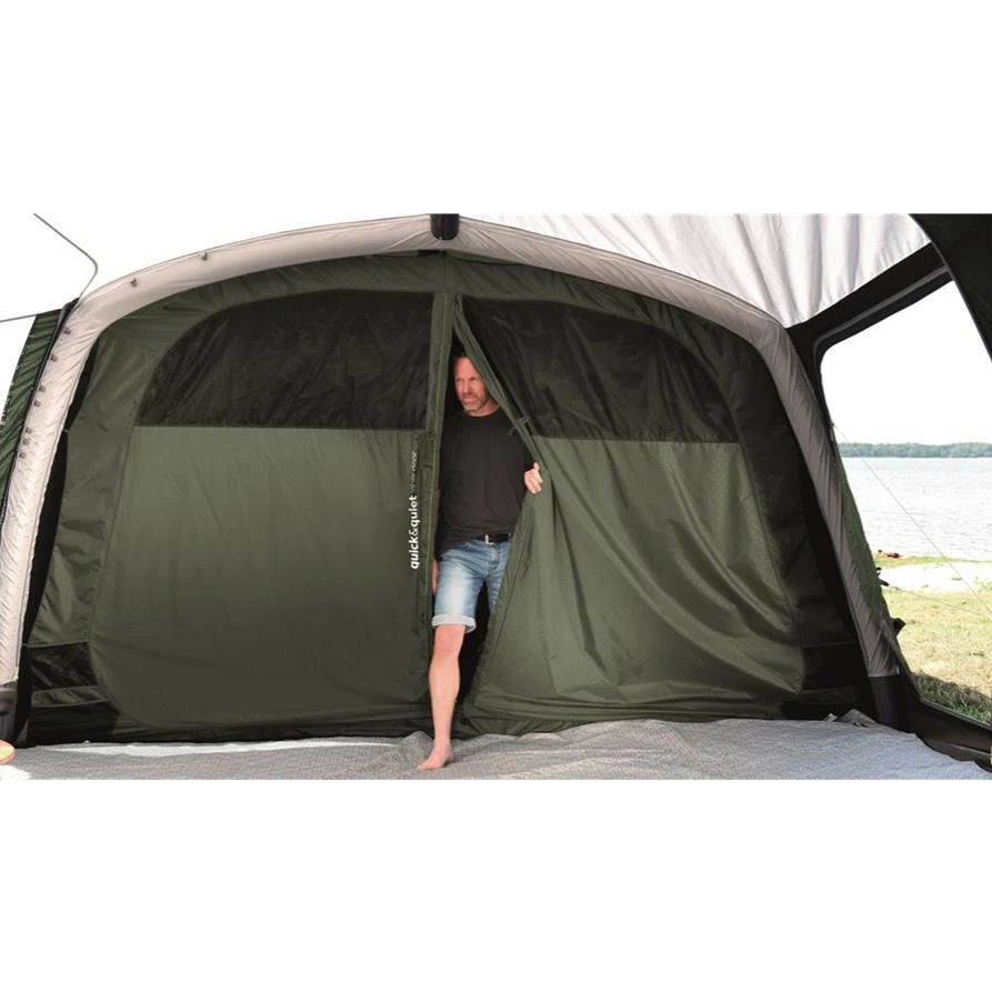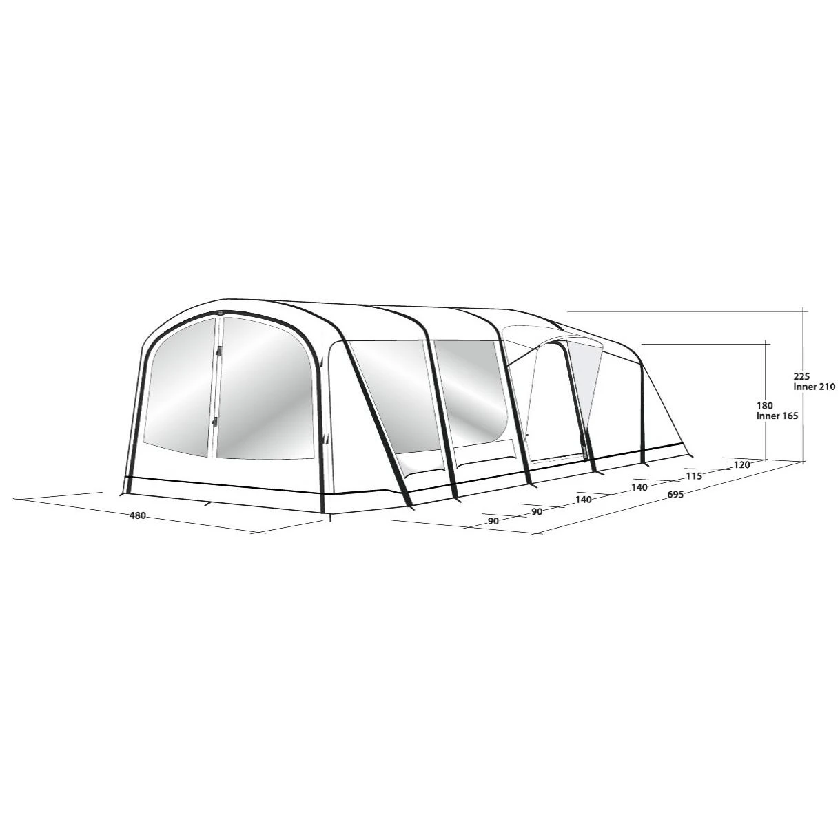 Das Outwell Sundale 7PA Familienzelt bietet 7 Personen problemlos Platz und eignet sich ideal für Deinen Wochenendtrip oder Rundreise mit der Familie oder Freunden. Durch das Rigid Air System ist das Zelt leicht auf- und abzubauen. Es ist dank seines Luftschlauchsystems innerhalb weniger Minuten aufgebaut. Vorgeformte Luftschläuche im gotischen Stil sorgen für zuverlässige Stabilität, viel Kopffreiheit und steilere Wände, um den Wohnraum zu maximieren. Das Sundale 7PA ist aufgeteilt in einen Nassbereich, einen Wohn- und einen Schlafbereich. In das Innere des Zeltes, indem du die volle Stehhöhe hast, gelangst Du durch die mit einem Moskitonetz ausgestatteten Vordertür. Die Vordertür ist mit einem doppelten Reißverschluss versehen und kann komplett geöffnet werden. Außerdem verfügt die Fronttür über den Quick and Quiet Magnetverschluss und kann somit geräuschlos geöffnet und verschlossen werden. Das vordere Innenzelt kann ideal als Stauraum oder zusätzliche Schlafkabine genutzt werden. Um den Wohnraum zu vergrößern, lässt sich die zusätzliche Schlafkabine auch einfach herausnehmen. Die drei Master-Schlafkabinen sind abgedunkelt, sodass Deine Nächte länger und entspannter werden. Darüber hinaus ist die Tür mit dem Quick and Quiet-Magnetverschluss versehen, mit dem Du die Schlafkabine geräuschlos öffnen und verlassen kannst. Für einen besseren Schlafkomfort sind die Schlafkabinen zusätzlich mit Lüftungsöffnungen mit Netzstoff ausgestattet. Diese können abgedunkelt oder geöffnet werden. Des Weiteren bieten die Schlafkabinen mehr Kopffreiheit und eine Kabeldurchführung. Im Innenzelt befinden sich an den Seitenwänden Netztaschen. Dort kannst Du Zeitschriften oder ähnliches verstauen. Zu den weiteren Ausstattungsmerkmalen des Sundale 7PA gehören unter anderem zusätzliche mit Moskitonetzen ausgestattete Seitentüren, die Dir einen flexiblen Zugang ins Zelt gewähren und große, getönte Fenster mit Reißverschlussvorhängen, mit denen Du einen hervorragenden Blick auf Deine Umgebung hast. Wenn Du hingegen mehr Privatsphäre genießen möchtest, können die Fenster auch komplett geschlossen werden. Damit Dein Zelt ein wenig wohnlicher wird, verfügt das Zelt über das HookTrackSystem. Dieses System bietet Dir vielseitige Möglichkeit Gegenstände oder Lampen aufzuhängen. Neben dem Baumwollmischgewebe, welches für ein gutes Raumklima sorgt, sorgt das neue Hinterlüftungssystem (Rear-Ventilation-System) für eine optimale Belüftung des Zeltes. Diese kann sowohl bei geschlossenem als auch beim geöffneten Zelt benutzt werden.