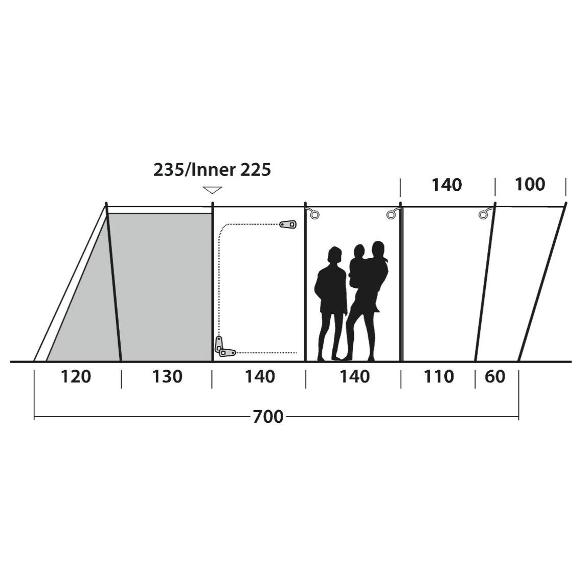 Das Outwell Vermont 7PE Familienzelt bietet 7 Personen Platz und eignet sich ideal für Deine Reise mit der Familie oder Freunden. In das Innere des Zeltes, gelangst Du durch die mit einem Moskitonetz und einem Quick and Quiet-Magnetverschluss ausgestatteten Vordertür. Das Vordach mit der vertikalen Frontwand erweitert Deinen Drei-Zonen-Zeltbereich in folgende Bereiche: Einen Nassbereich, zwei Bereiche zum Wohnen und zwei Bereiche zum Schlafen. Die Vordertür ist mit einem doppelten Reißverschluss versehen und kann komplett geöffnet werden. Die zwei Master-Schlafkabinen vom Typ Ambassador sind abgedunkelt, sodass Deine Nächte länger und entspannter werden. Darüber hinaus ist die Tür mit dem Quick and Quiet-Magnetverschluss versehen, mit dem Du die Schlafkabine geräuschlos öffnen und verlassen kannst. Für einen besseren Schlafkomfort sind die Schlafkabinen zusätzlich mit Lüftungsöffnungen mit Netzstoff ausgestattet. Die können bei Bedarf abgedunkelt und geschlossen werden. Im Innenzelt befinden sich an den Seitenwänden Netztaschen. Dort kannst Du Zeitschriften oder ähnliches verstauen. Zu den weiteren Ausstattungsmerkmalen des Vermont 7PE gehören zwei zusätzliche Seiteneingänge, die Dir einen flexiblen Zugang ins Zelt gewähren. Die großen, getönten Fenster mit Reißverschlussvorhängen bieten Dir in deinem Zelt einen besonders guten Lichteinfall. Außerdem hast Du einen hervorragenden Blick auf Deine Umgebung. Wenn Du hingegen mehr Privatsphäre genießen möchtest, können die Fenster auch komplett geschlossen werden. Damit Dein Zelt ein wenig wohnlicher wird, verfügt das Zelt über das HookTrackSystem. Dieses System bietet Dir vielseitige Möglichkeit Gegenstände oder Lampen aufzuhängen. Für eine optimale Belüftung sorgt das neue Rear Ventilation System. Diese kann sowohl bei geschlossenem als auch beim geöffneten Zelt benutzt werden. Abschließend verfügt das Vermont 7PE über das Floating Guyline System. Dieses System reduziert den Aufwand beim Aufstellen des Zeltes, beseitigt Stolperfallen und vereinfach das Anpassen der Seilspannung am Zelt.
