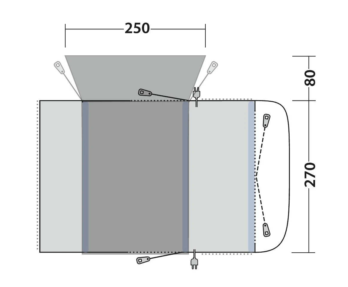 Das Outwell Wolfburgburg 380 Air Busvorzelt ist ideal für Dich, wenn Du in Deinem Urlaub nicht nur an einem Fleck bleiben möchtest. Du kannst das Luft-Vorzelt einfach stehen lassen und Tagesausflüge machen. Es eignet sich sehr gut für Fahrzeuge mit einer Anschlusshöhe von 175-200 cm. Die Fronttür und die Seitentüren wurden mit einem Moskitonetz ausgestattet. So kannst Du die Tür auch an lauen Abenden geöffnet lassen und wirst nicht von Insekten gestört. Die Fronttür kann bei Bedarf auch komplett zur Seite gerollt werden, sodass Du Dich fühlst als würdest Du direkt im Freien sitzen. Große, leicht getönte Fenster lassen Tageslicht ins Innere des Wolfburg 380 Air. Möchtest Du Dich vor neugierigen Blicken schützen, kannst Du die Gardinen einfach verschließen. Vorgeformte Luftschläuche sorgen für große Kopffreiheit und viel Platz im Inneren. Der Wohnraum wurde mit dem HookTrack System ausgestattet, an dem Du unkompliziert Beleuchtung und Kabel befestigen kannst. Eine herausnehmbare Bodenplane mit Zugluftstopper ist ebenfalls vorhanden. Doppelt angebrachte Keder (Stärke 5 mm) sorgen dafür, dass Du Dein Fahrzeug ohne Probleme anbringen kannst. Möchtest Du eine Schlafkabine oder einen weiteren Raum für Dein Zelt haben, kannst Du diese optional dazu bestellen.