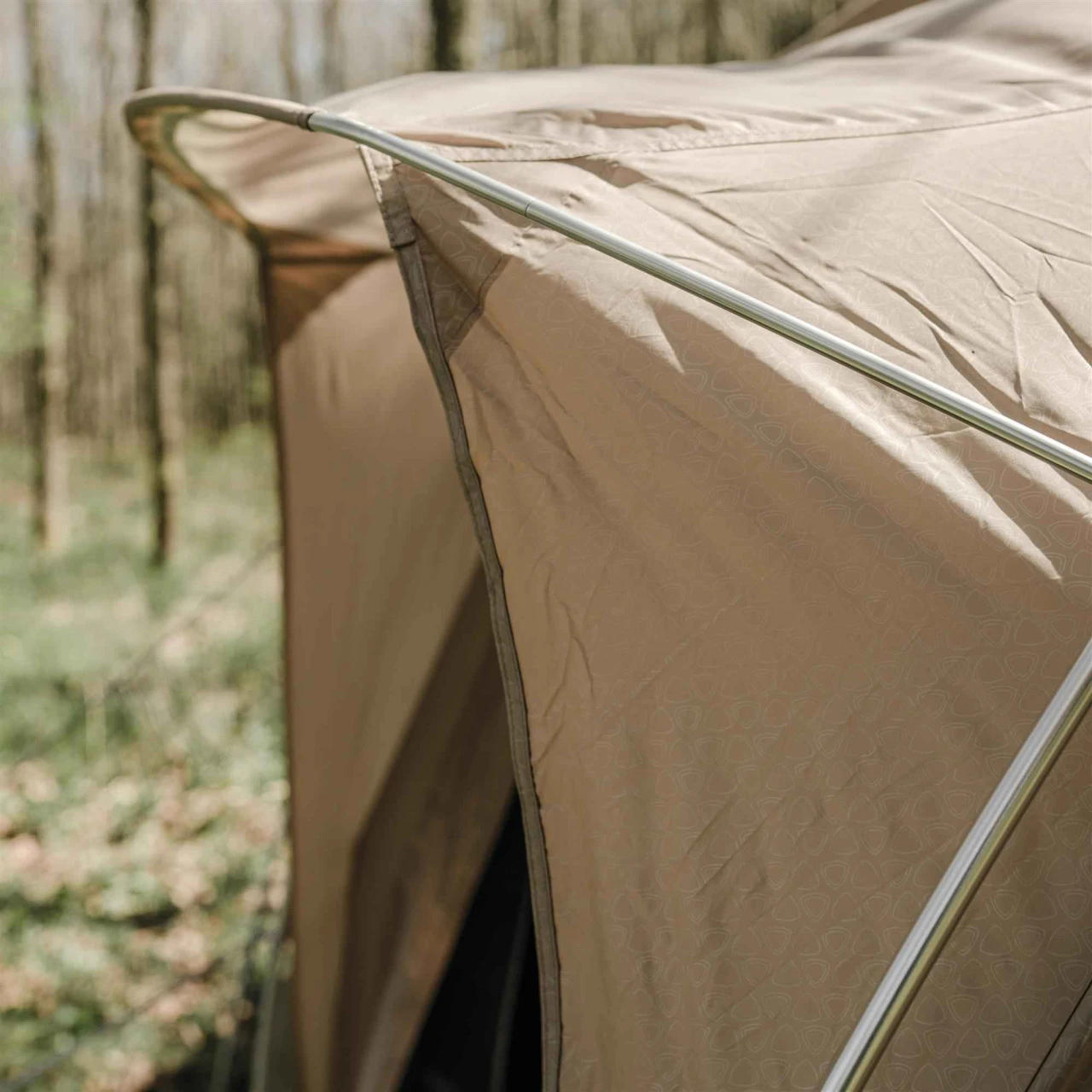 Den Wohnraum des Double Dreamer 4 könnt ihr durch den großen Fronteingang betreten, oder auch – z.B. bei schlechtem Wetter – durch den überdachten Seiteneingang. Der eingenähte Zeltboden und die Moskitonetze an beiden Eingängen sorgen dafür, dass keine Insekten zu euch ins Zelt kommen, wenn ihr das nicht möchtet. Damit es an heißen Tagen trotzdem erträglich, hell und freundlich im Zelt bleibt, ist das Außenmaterial aus einem hellen Polyester gewoben.