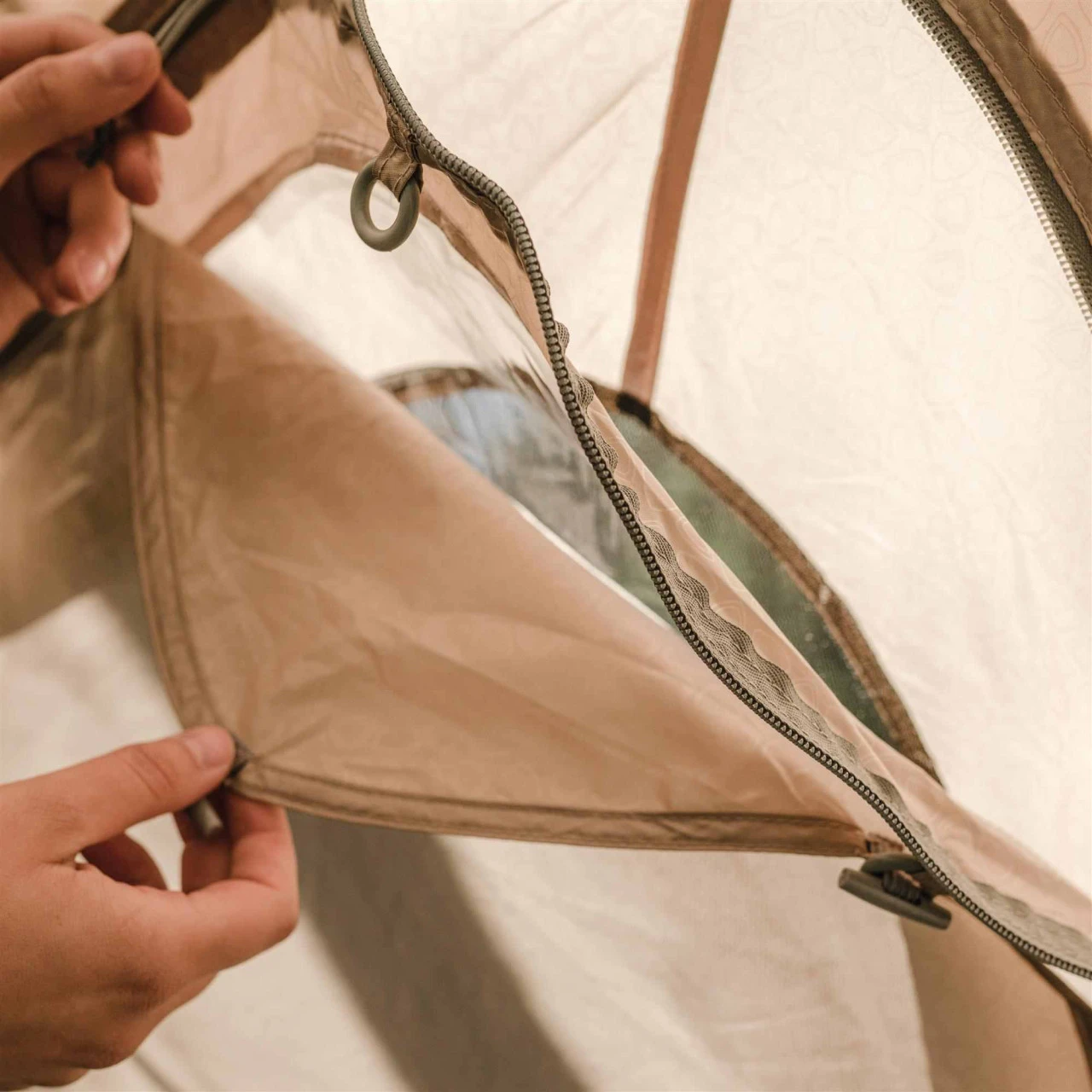 Die 3 Eingänge machen das Eagle Rock 5XP zu einem flexiblen Zelt. Der große Haupteingang kann komplett zur Seite gerollt werden. Dadurch erhältst du einen tollen Panoramablick aus dem Zelt. Außerdem bietet dir das große Vordach einen zusätzlichen Schutz bei Sonne und Regen. Der überdachte Seiteneingang auf der linken Seite ist ebenfalls überdacht. Auf der rechten Zeltseite befindet sich ein weiterer Seiteneingang, der auch komplett mit einem Moskitonetz ausgestattet ist. Die Tür kann zum Schutz vor Sonne mit optional erhältlichen Aufstellstangen zu einem Sonnensegel verwandelt werden.
