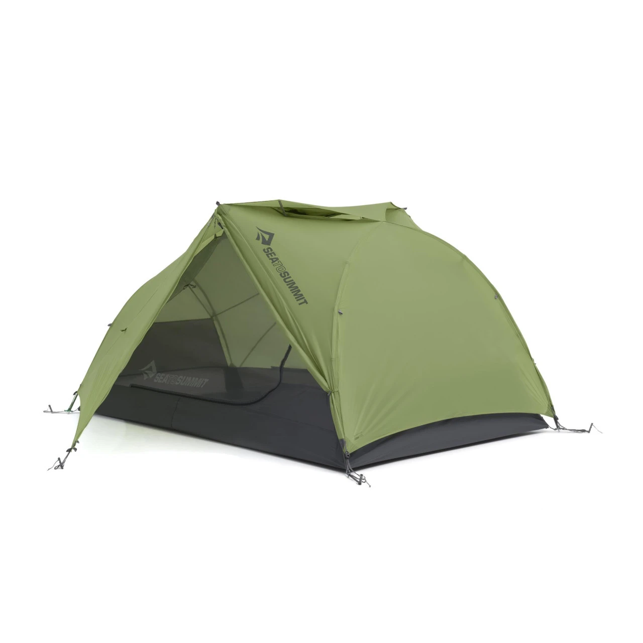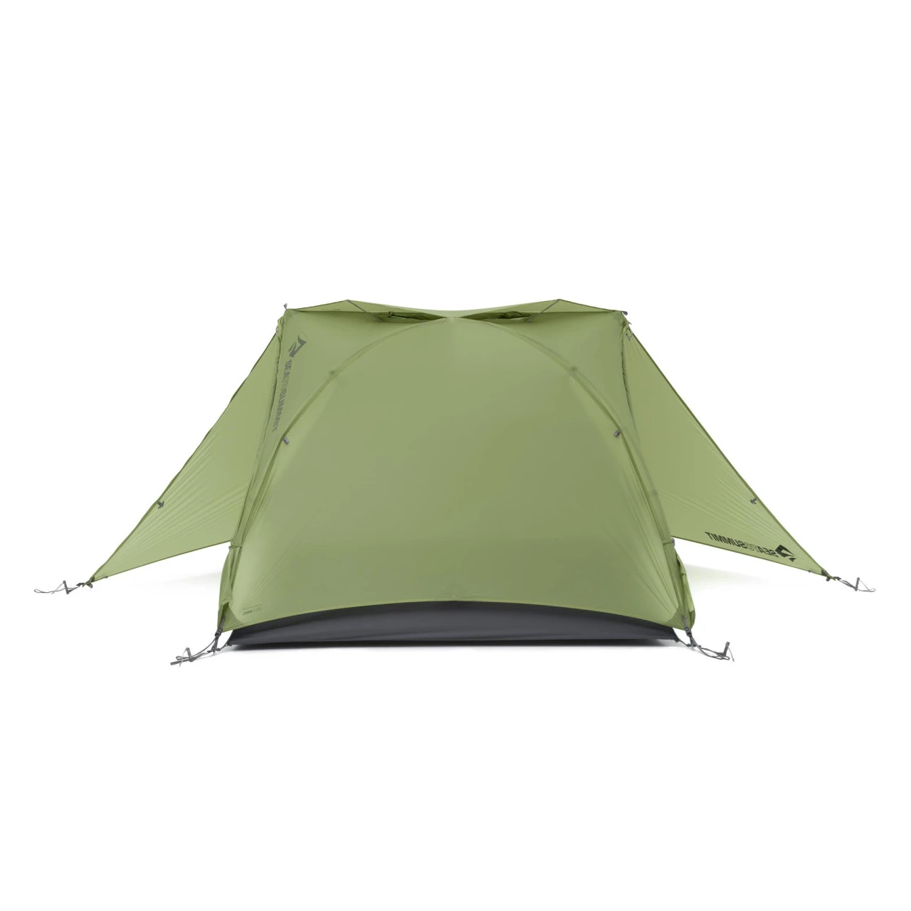 Das Telos TR2 Trekkingzelt von Sea to Summit setzt beim Thema nutzbarer Raum neue Maßstäbe. Bei der neuen Tension Ridge Architektur sind die beiden Querstangen nach oben geschwungen und nicht wie bei anderen Zelten nach unten geneigt. Dadurch gewinnt das Zelt mehr Höhe und bietet somit deutlich mehr Kopffreiheit, höhere Türen und größere Apsiden für mehr Stauraum.