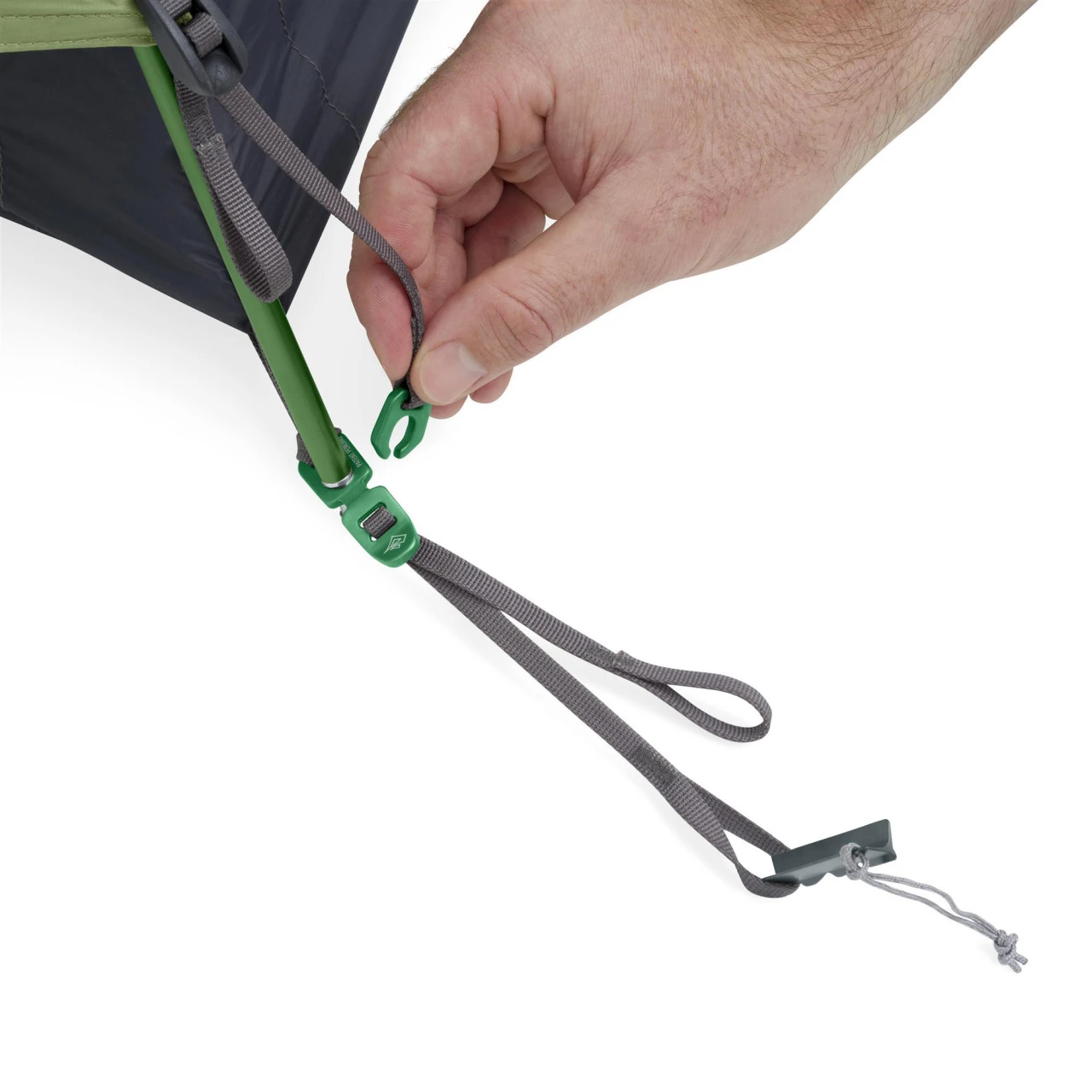 Das DAC Featherlite Aluminiumgestänge ist komplett verbunden, so dass das Zusammenstecken intuitiv fast von allein geht. Die farblich markierten Stangenenden werden in die dafür vorgesehenen Enden am Zelt gesteckt. Sea to Summit hat die Quick-Connect Pole Feets noch weiter verfeinert. Gefräste Aluminium Clips machen das Befestigen des Außenzeltes schnell und einhändig möglich. Die Aluminium Clips sind zudem noch deutlich haltbarer als Kunststoffschnallen.
