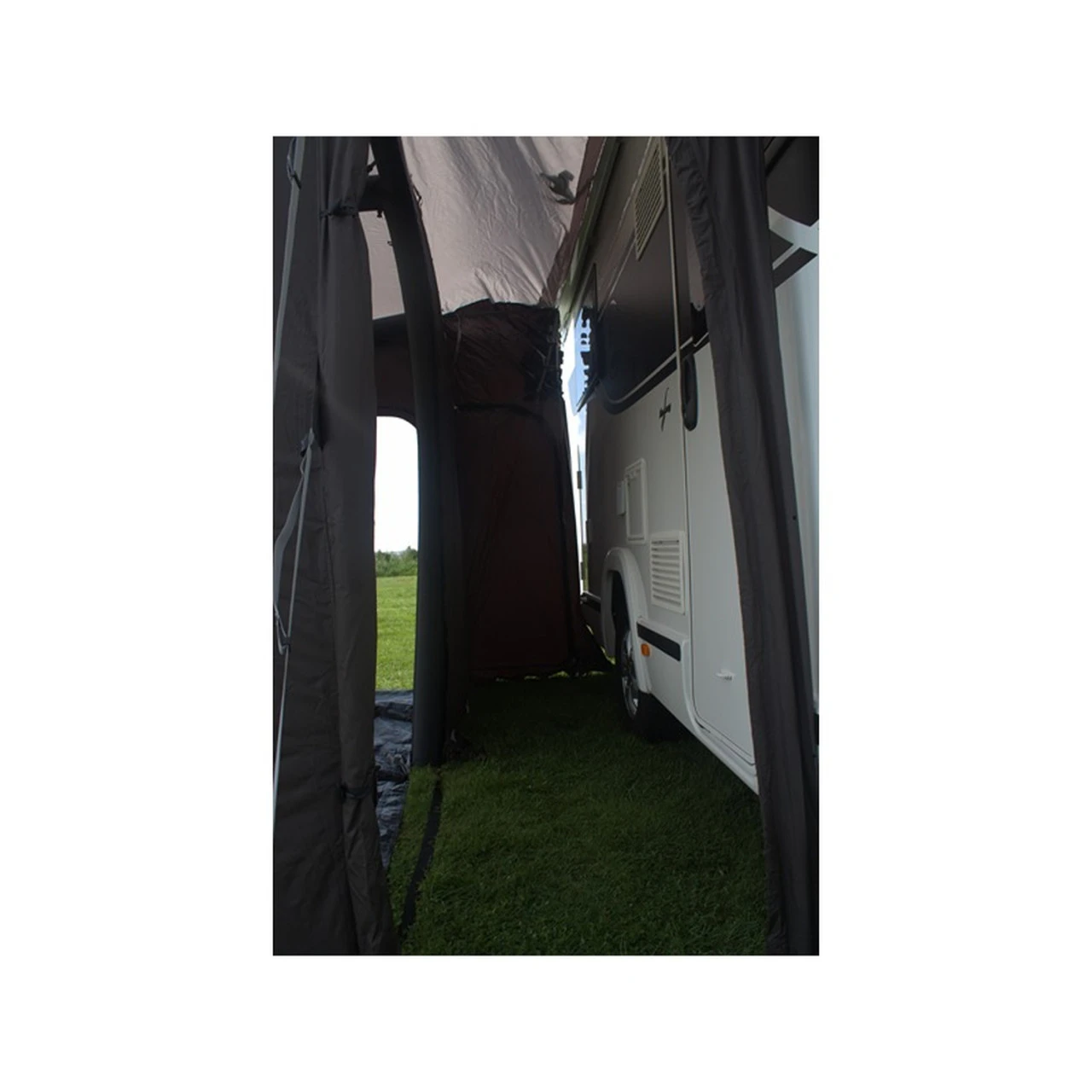 Bei dem Telta Pure Drive-Away 330 Wohnmobilvorzelt ist das herausragende Feature die komfortable und funktionale Frontwand. Es kann in die Mitte, nach oben gerollt oder auch vollständig herausgenommen werden. Die Front steht dabei senkrechter und schafft so mehr nutzbare Fläche und ein besseres Raumgefühl. Durch das Hochrollen der Frontwand kannst du das Telta Pure Drive-Away 330 Wohnmobilvorzelt auch als Sonnensegel nutzen. Die Schleuse zum Anschluss an dein Wohnmobil oder Kastenwagen ist in der Höhe von 220 – 300 cm anpassbar. Das Pure Drive-Away 330 verfügt ebenfalls über eine zippbare Rückwand und erlaubt so das Schließen des Zeltes, wenn du mit deinem Fahrzeug wegfahren möchtest. Dadurch, dass das Vorzelt eigenständig stehen bleiben kann, muss es nicht abgebaut werden. Das Telta Pure Drive-Away 330 Wohnmobilvorzelt besteht aus einem leichtgewichtigen, aber extrem robusten Rip-Stop-Polyester-Gewebe, dass dir ein geringes Packmaß und Gewicht ermöglicht und ist somit die ideale Voraussetzung für die Nutzung in Wohnmobilen und Kastenwagen. Das Pure Drive-Away 330 wird über ein zentrales Ventil aufgepumpt, da alle Schläuche mit robusten Ventilen verbunden sind.