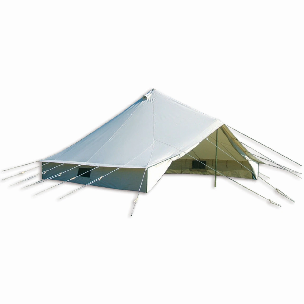 Das Tortuga Yellowstone Gruppenzelt ist eine gelungene Alternative zu Rundzelten. Acht bis zwölf Personen haben in dem Gruppenzelt reichlich Platz. Die Mittelhöhe von 250 cm bietet ein großzügiges Raumgefühl und die rechteckige Konstruktion nutzt die Grundfläche optimal aus. Das Stahlgestänge garantiert mit dem Holzmittelmast die Stabilität des Gruppenzeltes. Das atmungsaktive Baumwollgewebe sorgt mit den beiden Ventilationsöffnungen in der Zeltspitze und den kleinen Mesh-Fenstern in den 60 cm hohen Seitenwänden für ein angenehmes Zeltklima. Praktisch ist auch, dass die Zeltwand an der Eingangsseite komplett aufgerollt werden kann, sodass Ihr eine freie Sicht nach außen genießen könnt. Das Tortuga Yellowstone Gruppenzelt eignet sich deshalb ideal, um die Natur zu genießen.