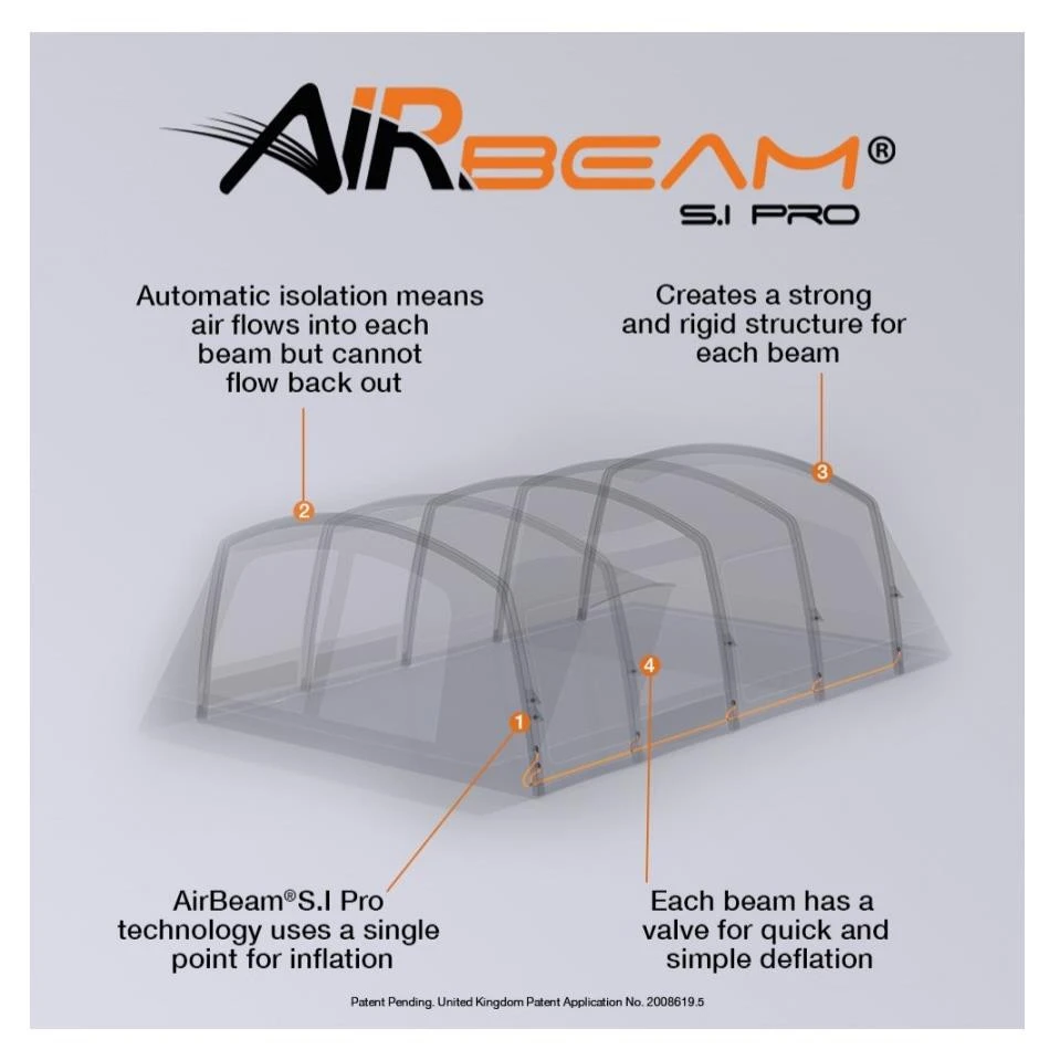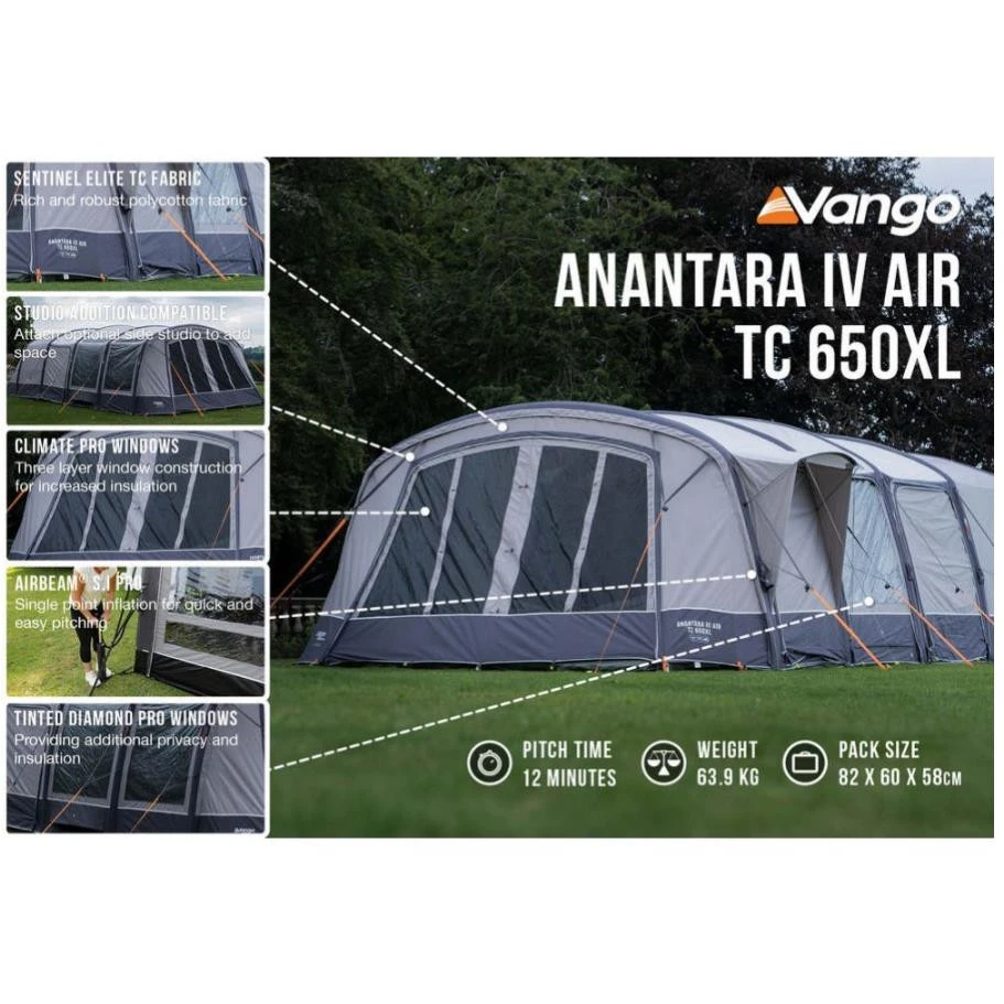 Das aufblasbare Vango Anantara IV Air TC 650XList ein großes Familienzelt mit einem Baumwoll-Mischgewebe und der revolutionären AirBeam® S.I Pro-Technologie von Vango, die das Aufstellen noch einfacher macht. Du musst das Zelt nur ausgebreitet hinlegen, an den Eckpunkten fixieren und mit der mitgelieferten Doppel-Hub-Pumpe aufpumpen. Das Sentinel Elite Gewebe ist eines der stärksten und haltbarsten Gewebe in der Vango Kollektion. in der TC-Version ist es eine Mischung aus 65% Polyester und 35% Baumwolle. Die Wassersäule liegt bei 5.000 mm. Die Eingangstür ist mit “Climate Pro Windows” ausgestattet. Hierbei handelt es sich um “3-lagige Fenster”: komplett offen schützen sie durch ihr durchgehendes Mesh vor Insekten, bieten aber eine optimale Belüftung. Wenn das Wetter schlechter wird, schliest du die Tür einfach mit einem PVC-Fenster. Wenn du am Abend deine Privatsphäre genießen willst, machst du zusätzlich noch den Vorhang zu und schon kann kein Nachbar mehr ins Zelt schauen. Über die gesamte Fläche des Vango Anantara IV Air TC 650XL ist eine robuste, strapazierfähige und wasserdichte PE-Bodenplane eingenäht. Es gibt mehrere Kabeleinführungsmöglichkeiten und am Eingang ist eine Kabelführung so angebracht, dass du ein Kabel ordentlich in den Markisenbereich an der Vorderseite des Zeltes führen kannst.