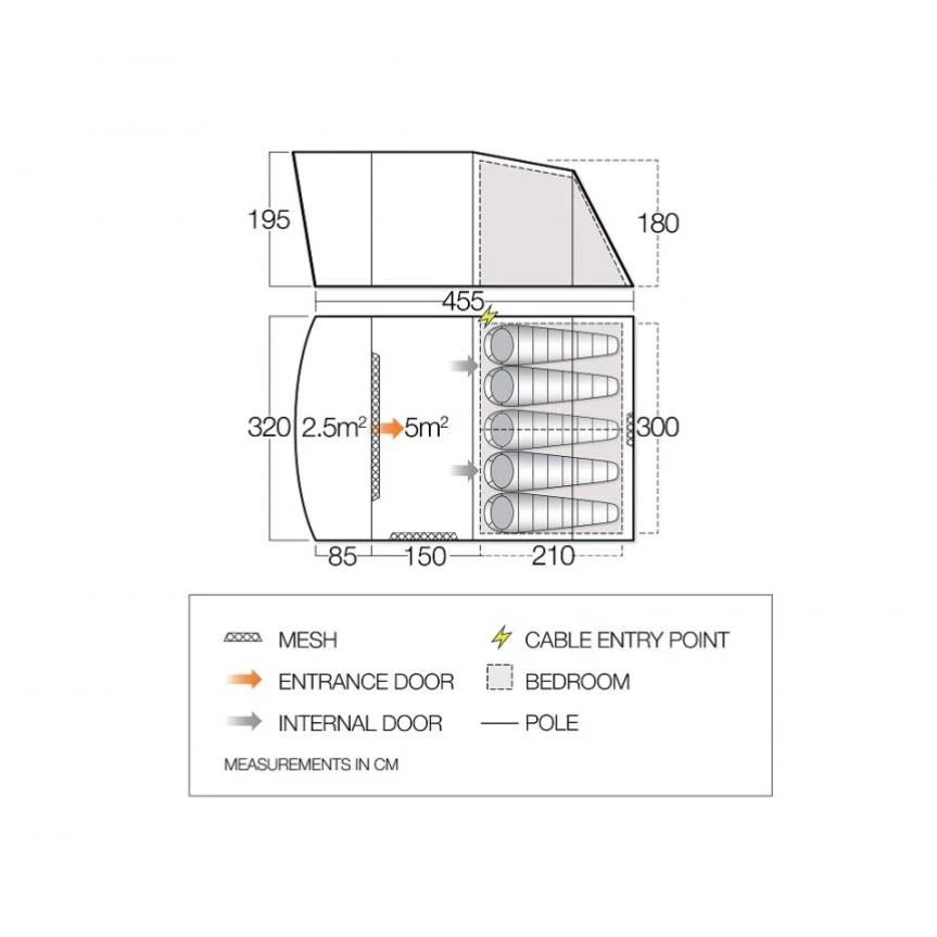 Um Abends bei Licht gemütlich mit Freunden zusammensitzen und Musik hören zu können, gibt es einen Kabelzugang mit Reißverschluss, durch den du ein Elektrokabel legen kannst. Eine Lampe kannst du an dem dafür vorgesehenen Lampenaufhängungspunkt aufhängen. Die Queen-Size Schlafkabine bietet Platz für bis zu 5 Personen. In diesem Innenzelt ist also pro Person 60 cm Platz zum Schlafen. Wenn ihr wollt, könnt ihr die Kabine auch teilen. So hast du entweder Platz für 2x 2 Personen oder du nutzt eine Seite als Stauraum für euer Gepäck. Das abgedunkelte atmungsaktive Nightfall Polyester sorgt dafür, dass du morgens nicht von den ersten Sonnenstrahlen geweckt wirst.
