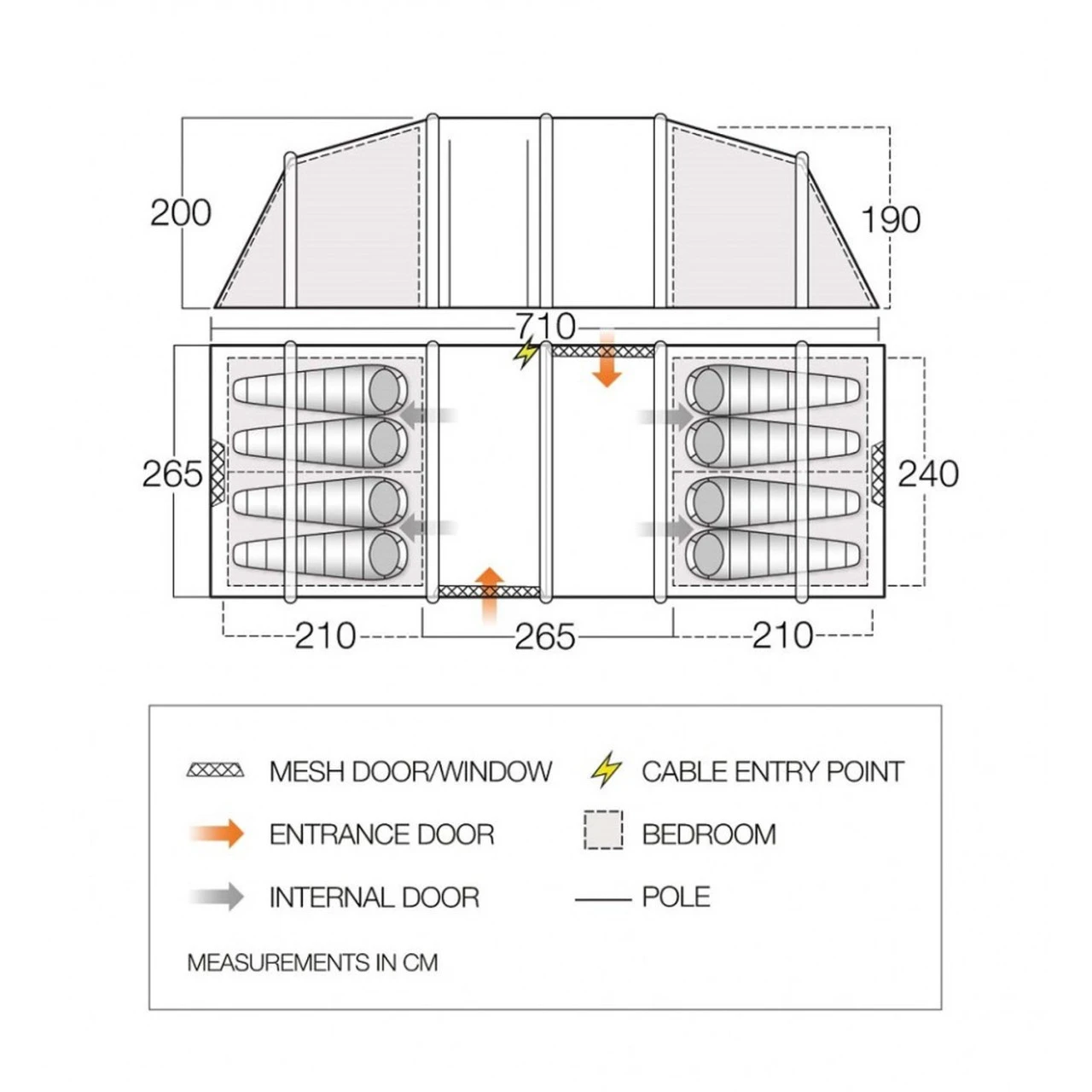 Das Vango Castlewood Air 800XL ist ein 8-Mann-Tunnelzelt mit gespiegeltem Layout und großzügigen Schlaf- und Wohnbereichen, das speziell für Camper entwickelt wurde, die privatere Schlafbereiche bevorzugen. Dank der AirBeam®-Technologie und dem neuen AirSpeed® Ventilsystem lässt sich das Zelt in wenigen Minuten aufstellen. VANGO´s patentiertes TBS®II (Tension Band System) stabilisiert das Zelt und das Gestänge bei extremen Wind um ein Vielfaches. Große Diamond Clear PVC-Fenster sorgen für maximale Helligkeit und Sichtbarkeit nach Draußen. Extra breite Queen-Schlafzimmer (60 cm pro Person) bieten viel Platz und flexible Trennvorhänge liefern Privatsphäre, wenn nötig und können zur Seite gerollt werden bei nichtgebrauch. Abgedunkelte Schlafkabinen sorgen außerdem für einen angenehmen Schlaf und kein ungewolltes Erwachen bei Sonnenaufgang. Beide Eingänge sind Mesh-Türen ausgestattet, sodass die Luft in heißen Sommernächten gut zirkulieren kann und lästige Insekten draußen bleiben müssen. Kabeldurchführungen, Laternenaufhängepunkte, Taschen in den Schlafkabinen, eingenähte Bodenplane, hochsichtbare Spannseile sind weitere Features, die dafür sorgen, dass du in deinem Urlaub höchsten Komfort genießen kannst. Außerdem ist im Paket ein zusätzlicher Zeltbodenschutz enthalten, der den Zeltboden und das Zelt schützt und seine Lebensdauer verlängert.