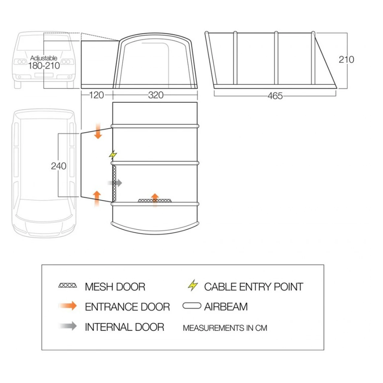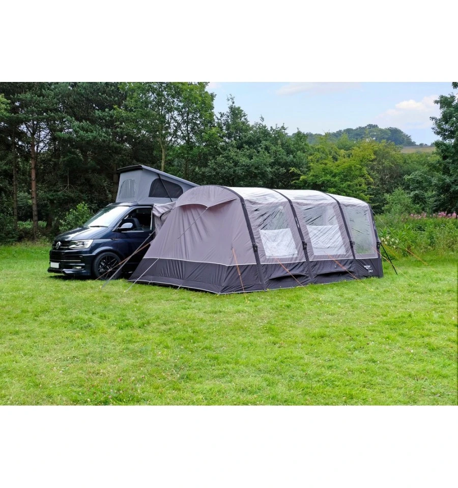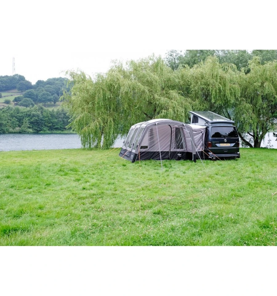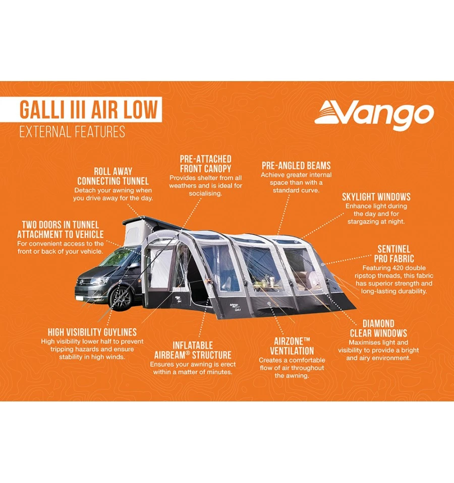 Das Vango Galli III Air Low Busvorzelt ist ein freistehendes Buszelt, was längs zum Fahrzeug steht. Durch die einzeln aufzupumpenden AirBeam Luftkanäle steht das Zelt in wenigen Sekunden. Das Sentinel Pro 420 Material ist ein Doppelripstop-Polyester, was sehr robust und reißfest ist, so dass die Lebensdauer des Galli III Air Low deutlich verlängert wird.