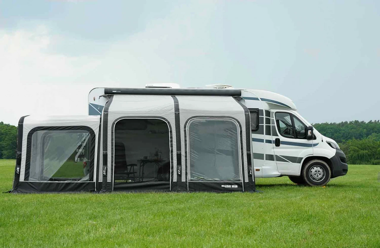 Das Westfield Vega 330 260 – 285 cm Wohnmobilvorzelt ist die ideale Wahl für Camper, die viel Reisen und oft den Standort wechseln. Dank des Advance Air System lässt es sich schnell auf- und abbauen. Es besteht außerdem aus dem reißfesten und strapazierfähigen HydroTech® CottonTouch-Material, welches speziell für Caravan und Reisemobile entwickelt wurde. Dieses Polyestergewebe ist besonders UV-beständig. Des Weiteren verleiht diese Beschichtung dem Zelt einen fühlbaren Baumwoll-Charakter. Durch die Tiefe von 250 cm hast du in deinem Vega Vorzelt ausreichend Platz für einen Tisch, Stühle und dein restliches Campingequipment. Mit den extra großen Fenstern in den Front- und Seitenwände erlebst du einen hervorragenden Panoramablick. Die Fenster kannst du mittels Reißverschlussvorhängen verschließen, damit du deine Privatsphäre genießen kannst. Ein optionales Vordach an der Front des Zeltes, das du mittels Keder anbringst, verschafft dir zusätzlich geschützten Raum – ob bei Sonne oder Regen.