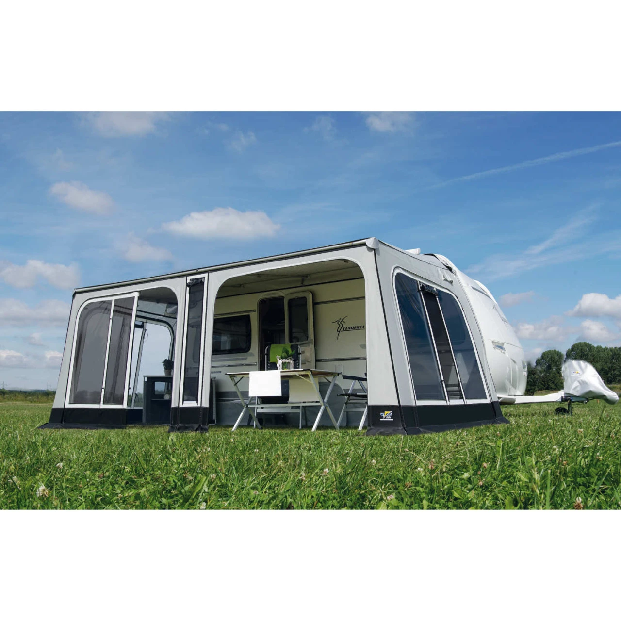 Mit dem Wigo Rolli Plus Panoramic Vorzelt wirst du dich wie in deinem Wohnzimmer rundum wohlfühlen. Modernes Design trifft auf eine hochwertige Ausstattung. Die großen Panoramafenster sorgen für viel Licht und eine wunderbare Sicht nach außen. Mit den ausgestatteten Air-Vent-Fenstern kannst du dein Vorzelt optimal belüften. Das Dach des Rolli Plus Panoramic Vorzelt besteht aus vollsynthetischem TenCate All-Season Material, was einseitig beschichtet ist. Die Unterseite ist bedruckt und reduziert dadurch Schwitzwasserbildung. Die Vorder- und Seitenwände kannst du entweder zur Veranda abklappen oder komplett rausnehmen, sodass du nur noch ein Sonnendach hast.