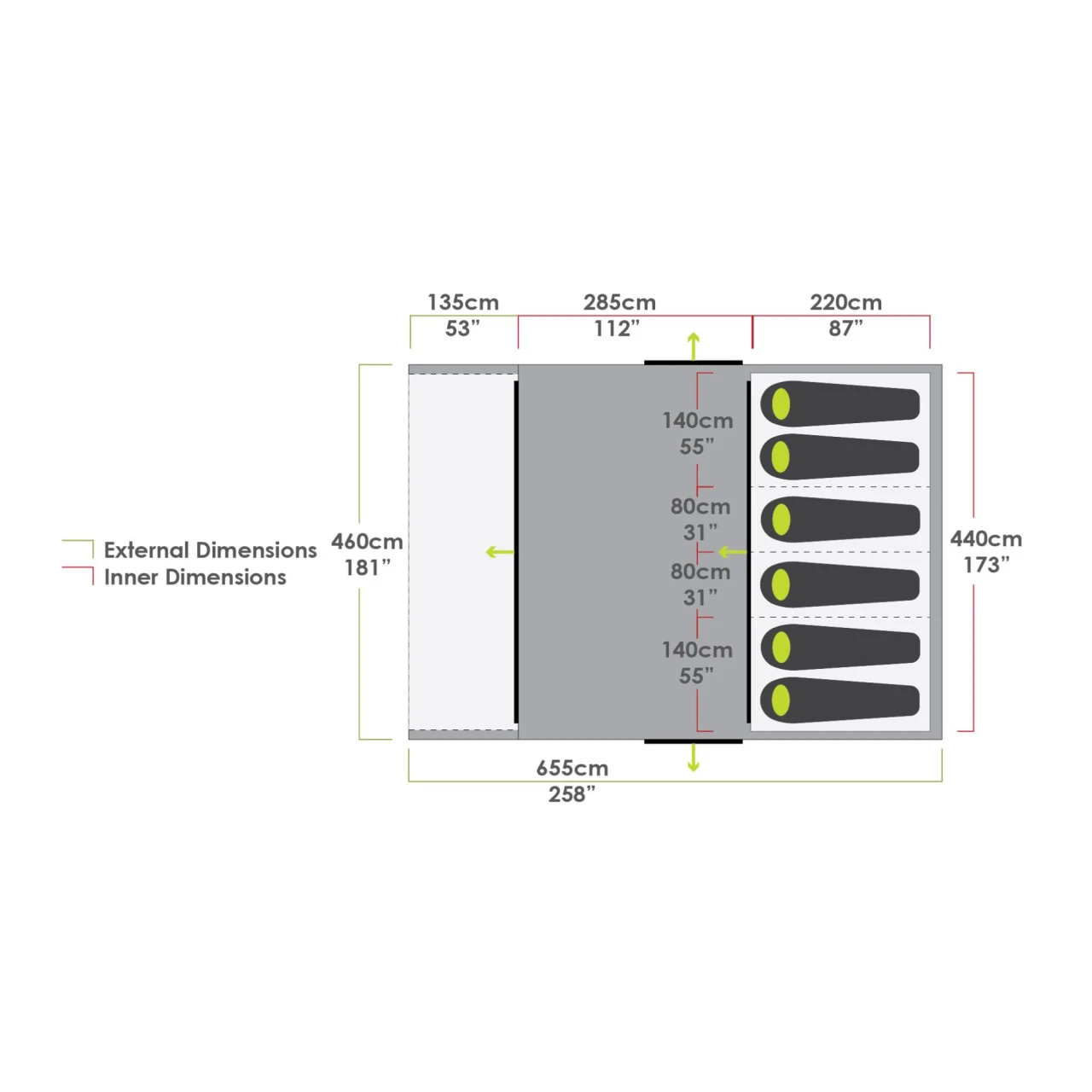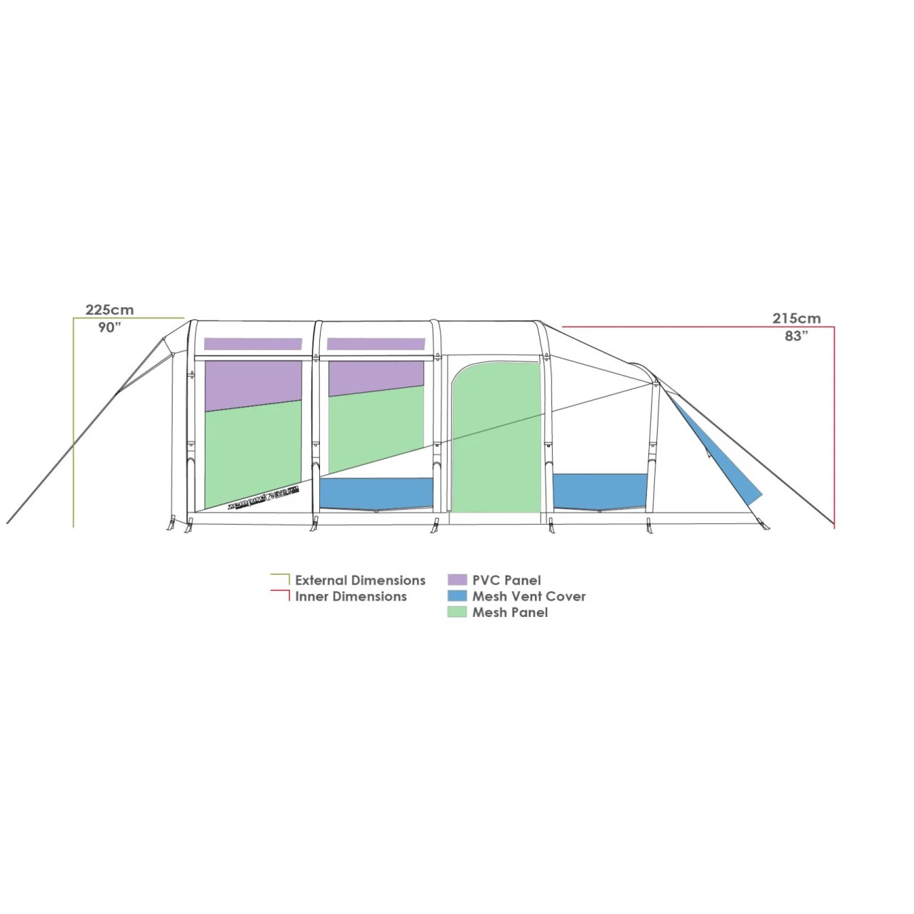 Das Zempire Evo TXL V2 Familienzelt ist das ideale Einsteiger-Zelt für Paare oder Familien. Der große Vorraum, die PVC-Dachfenster und die hervorragende Belüftung machen das Evo TXL V2 Familienzelt zu einem komfortablen Zelt. Ein lichtreflektierendes Material innerhalb der Schlafkabine sorgt für ungestörten Schlaf an Morgenden. Die abgewinkelte Balkenkonstruktion bietet verbesserte Windstabilität und Kopffreiheit im gesamten Zelt. Ein doppelwandiges Fenster erzeugt einen angenehm kühlen Luftstrom in warmen Nächten. Getönte PVC-Fenster bieten Privatsphäre im Zelt, ohne die Sicht einzuschränken. Dank dem aufblasbaren AirFrame System ist das Zelt im Handumdrehen auf- und abgebaut. Zusätzlich kommt die SeroLink Technologie zum Einsatz, die das Gestänge direkt mit dem Außenzelt verbindet. Dies sorgt nicht nur für ein Plus an Belastbarkeit und Flexibilität, sondern spart auch noch Gewicht. Darüber hinaus garantiert die abgewinkelte Konstruktion eine maximale Kopffreiheit. Das Außenzelt aus strapazierfähigem Oxford Polyester verfügt über getapte Nähte und bietet somit auch bei Starkregen zuverlässigen Wetterschutz.