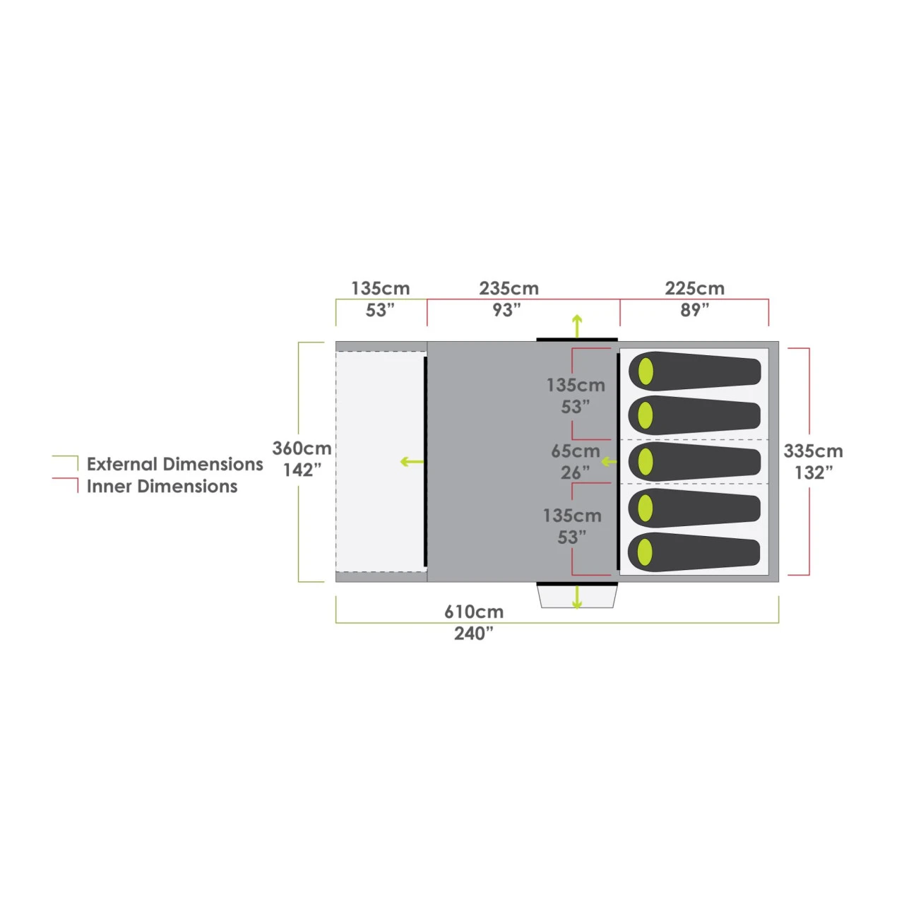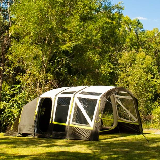 Das Zempire Pro TL V2 Familienzelt verfügt über einen zentralen Aufblaspunkt, der sich in einem Schritt aufblasen lässt. Der große Vorzeltbereich kann mühelos mit einem optionalen Wandset oder direkt mit einer Zempire Aerobase 3 Pro Pavillon verbunden werden. Der geräumige Wohnbereich im Inneren bietet Platz zum Ausbreiten und Entspannen geschützt vor jedem Wetter. Der hintere Multiroom-Schlafraum sorgt für ultimative Flexibilität bei der Raumaufteilung. Das Pro TL V2 Familienzelt besteht aus einem hochwertigem Polyester Material und ist die perfekte Wahl für eine große Familie, die mehr Platz zum Ausbreiten und Entspannen schätzt. Zudem verfügt das Zelt über eine geschützte Heckbelüftung, die in warmen Nächten für einen kühlen und schattigen Luftstrom sorgen.