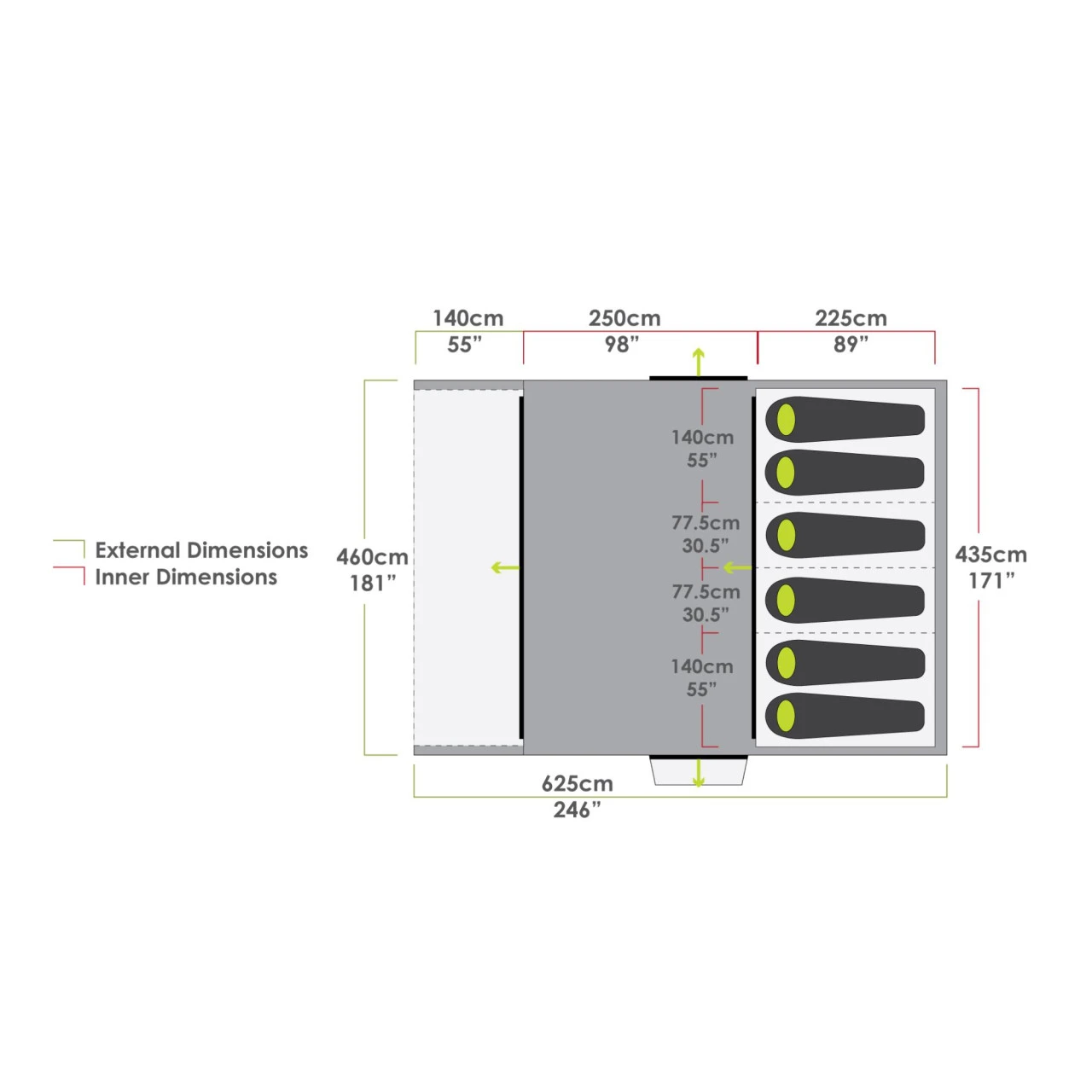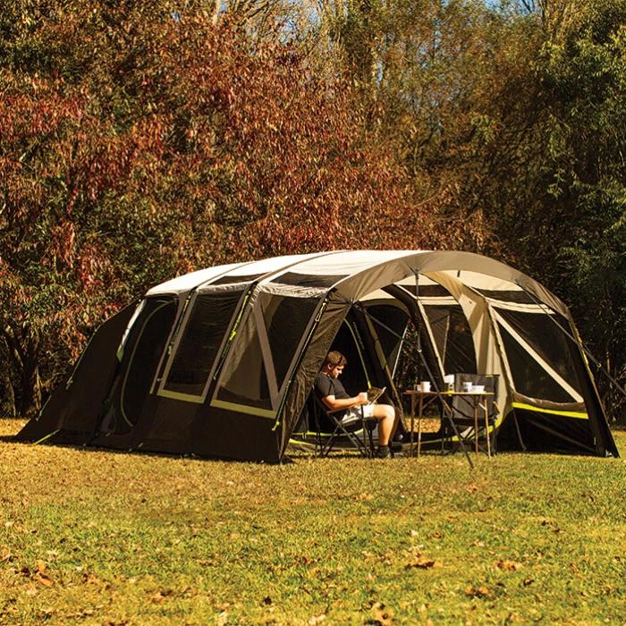 Das Zempire Pro TXL V2 Familienzelte verfügt über ein Ein-Aufblaspunkt-System, der sich in einem Schritt aufblasen lässt. Der große Vorzeltbereich kann mühelos mit einem optionalen Wandset oder direkt mit einer Zempire Aerobase 3 Pro Pavillon verbunden werden. Der geräumige Wohnbereich im Inneren bietet Platz zum Ausbreiten und Entspannen geschützt vor jedem Wetter. Der hintere Multiroom-Schlafraum sorgt für ultimative Flexibilität bei der Raumaufteilung. Das Pro TXL V2 Familienzelt besteht aus einem hochwertigem Polyester Material und ist die perfekte Wahl für eine große Familie, die mehr Platz zum Ausbreiten und Entspannen schätzt. Zudem verfügt das Zelt über eine geschützte Heckbelüftung, die in warmen Nächten für einen kühlen und schattigen Luftstrom sorgen.